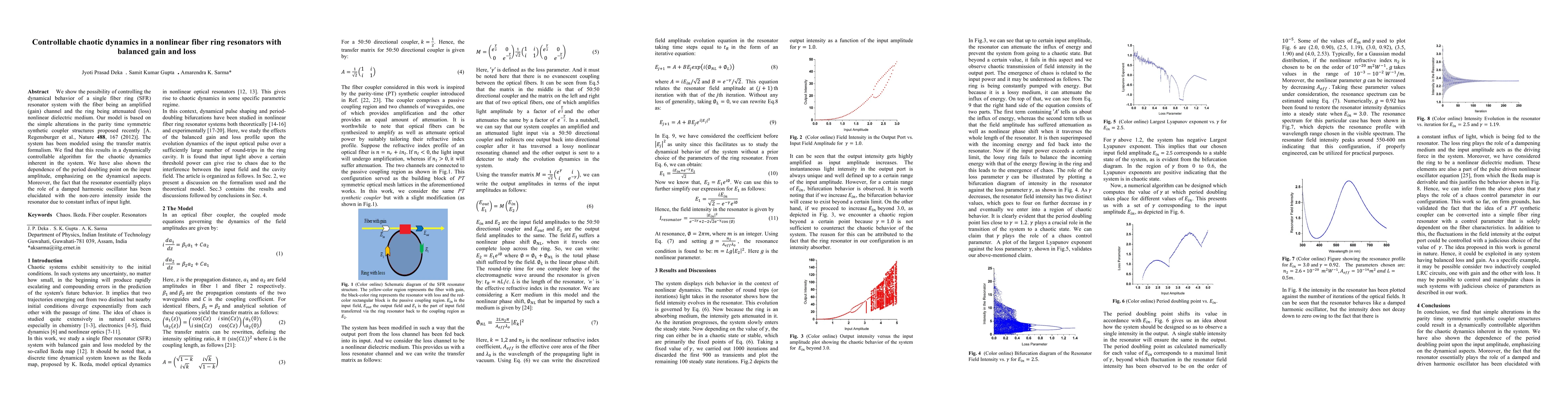 This paper demonstrates the control of chaotic dynamics in a nonlinear fiber ring resonator using balanced gain and loss, modeled via the transfer matrix formalism. The system exhibits dynamical controllability and period doubling dependence on input amplitude, functioning akin to a damped harmonic oscillator.