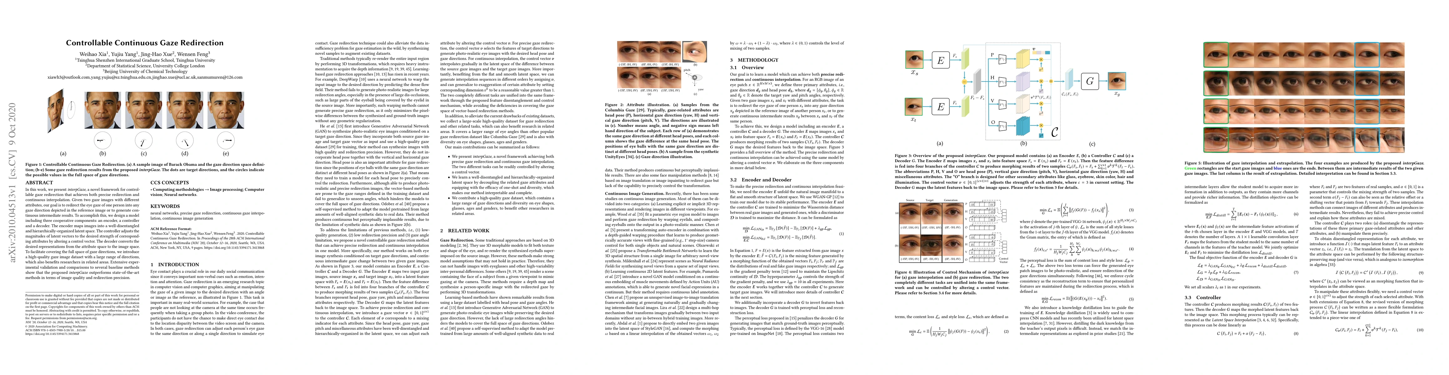 This paper introduces interpGaze, a framework for precise and continuous gaze redirection using an encoder-controller-decoder model, and demonstrates superior performance over baseline methods with a new high-quality gaze image dataset.