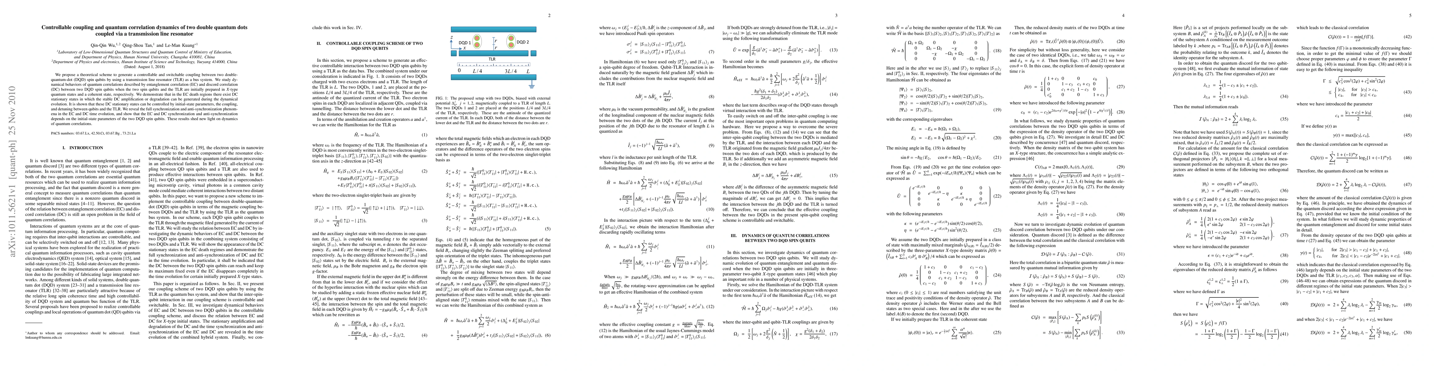 This paper proposes a theoretical scheme for generating controllable coupling between two double-quantum-dot spin qubits via a transmission line resonator, studying quantum correlation dynamics, and demonstrating that quantum discord can exhibit stable amplification or degradation controlled by initial parameters and coupling. The study reveals synchronization and anti-synchronization phenomena in quantum correlations.