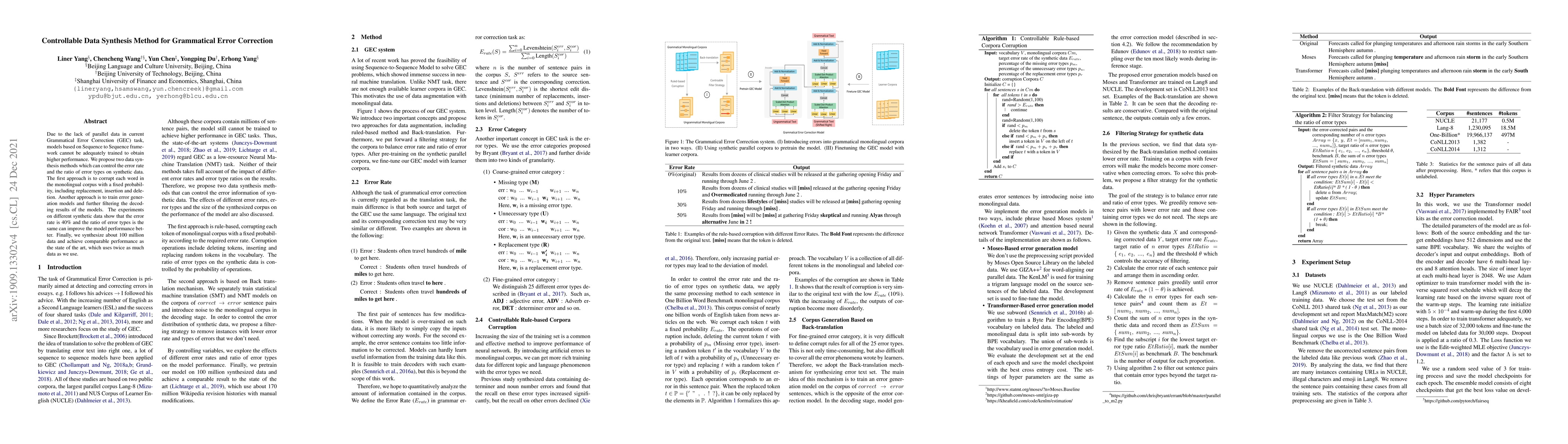 This paper proposes two controllable data synthesis methods to enhance Grammatical Error Correction (GEC) models, addressing the lack of parallel data. The methods include word corruption and error generation models, achieving a 40% error rate and maintaining error type ratios, which improve model performance. The synthesized data enables comparable GEC performance using only half the amount of data compared to state-of-the-art methods.