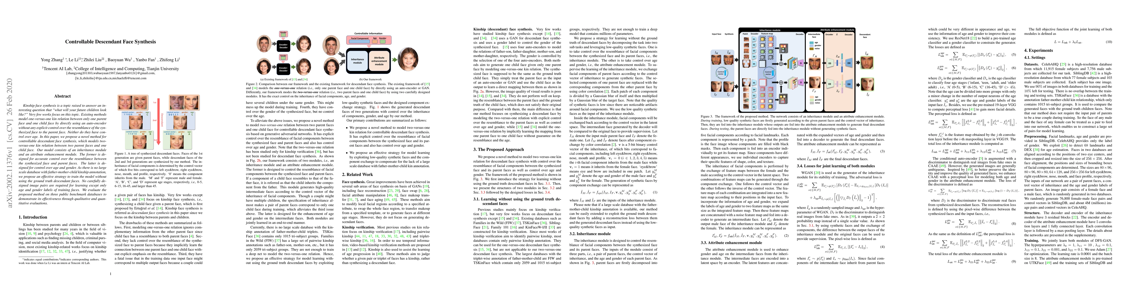 This paper presents a novel method for controllable descendant face synthesis that models the two-versus-one kin relation between two parent faces and one child face. The proposed model includes an inheritance module for resemblance control and an attribute enhancement module for age and gender control, trained without ground truth descendant faces.