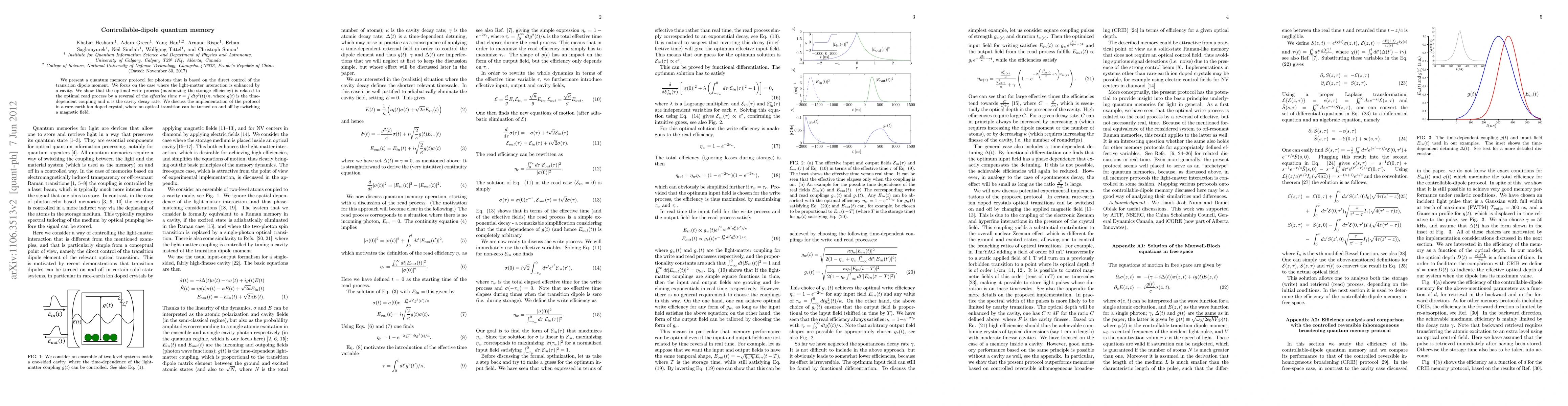 We present a quantum memory protocol for photons that is based on the direct control of the transition dipole moment. We focus on the case where the light-matter interaction is enhanced by a cavity. We show that the optimal write process (maximizing the storage efficiency) is related to the optimal read process by a reversal of the {\it effective time} $\tau=\int dt g^2(t)/\kappa$, where $g(t)$ is the time-dependent coupling and $\kappa$ is the cavity decay rate. We discuss the implementation of the protocol in a rare-earth ion doped crystal, where an optical transition can be turned on and off by switching a magnetic field.
