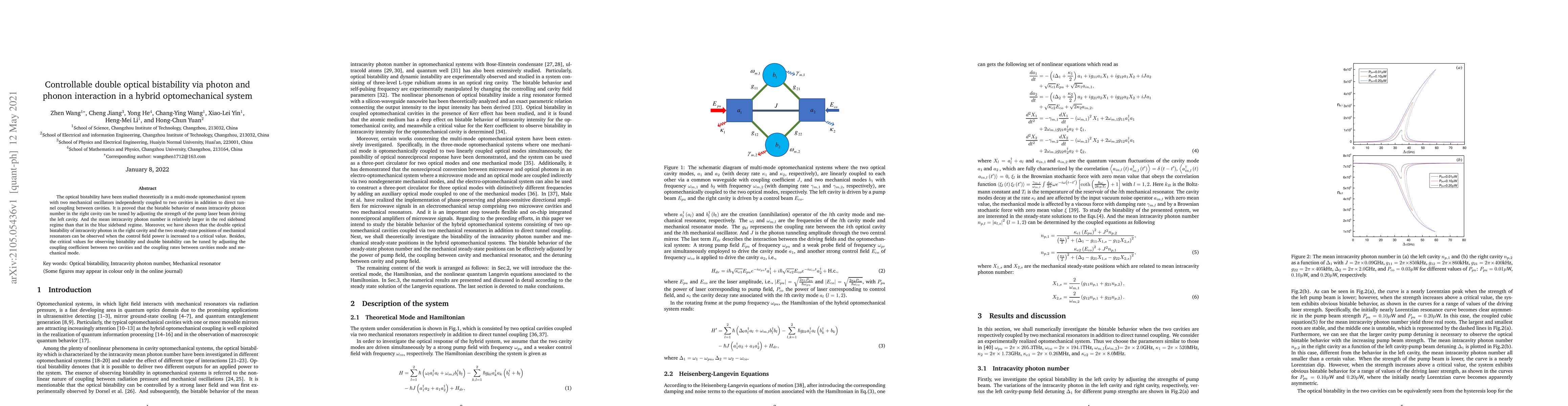This paper investigates controllable double optical bistability in a hybrid optomechanical system where two mechanical oscillators are coupled to separate cavities, with direct tunnel coupling between the cavities. The study shows that the optical bistability can be tuned by adjusting the pump laser strength, and double bistability can be observed when the control field power reaches a critical value, with tunability achieved via cavity coupling and mode-coupling rates.