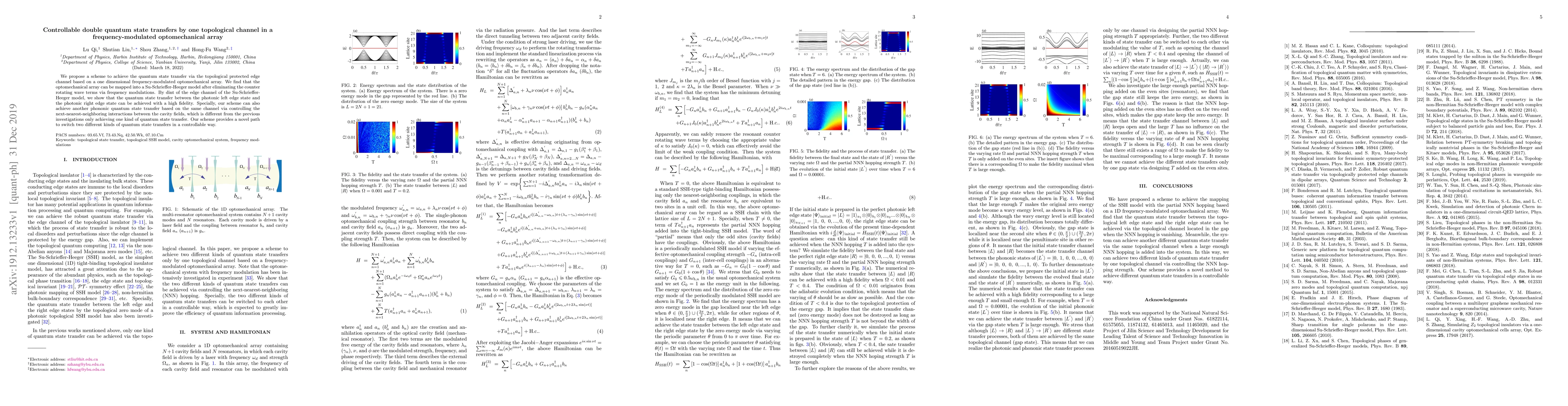 We propose a scheme to achieve the quantum state transfer via the topological protected edge channel based on a one dimensional frequency-modulated optomechanical array. We find that the optomechanical array can be mapped into a Su-Schrieffer-Heeger model after eliminating the counter rotating wave terms via frequency modulations. By dint of the edge channel of the Su-Schrieffer-Heeger model, we show that the quantum state transfer between the photonic left edge state and the photonic right edge state can be achieved with a high fidelity. Specially, our scheme can also achieve another phononic quantum state transfer based on the same channel via controlling the next-nearest-neighboring interactions between the cavity fields, which is different from the previous investigations only achieving one kind of quantum state transfer. Our scheme provides a novel path to switch two different kinds of quantum state transfers in a controllable way.