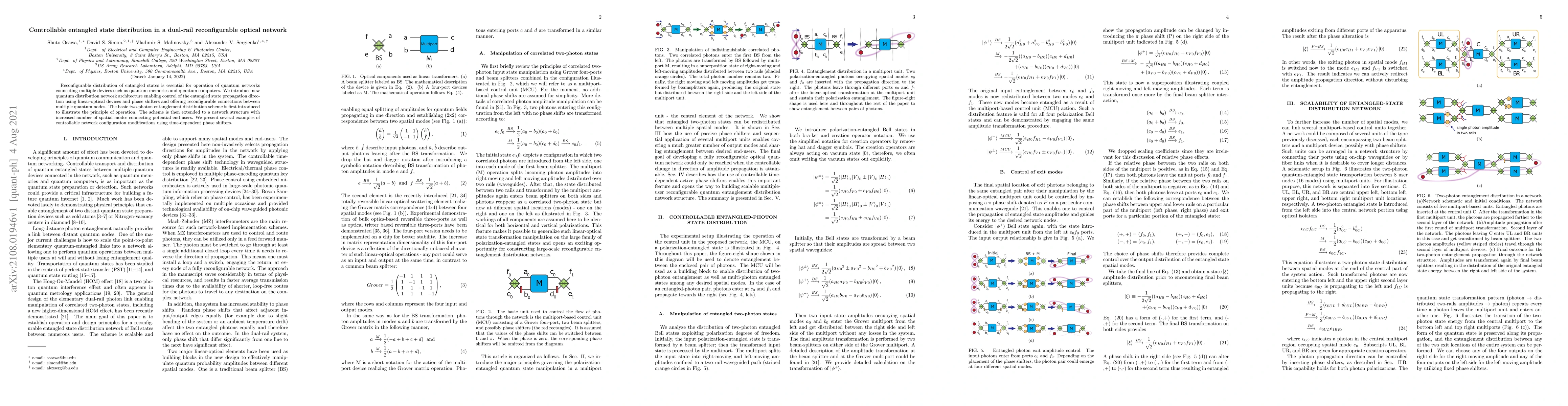 This paper proposes a novel architecture for a reconfigurable optical network that enables controllable distribution of entangled states using linear-optical devices and phase shifters. The network allows for dynamic connections between quantum nodes and demonstrates the principle through a basic two-photon entanglement scheme, which can be extended to larger networks.