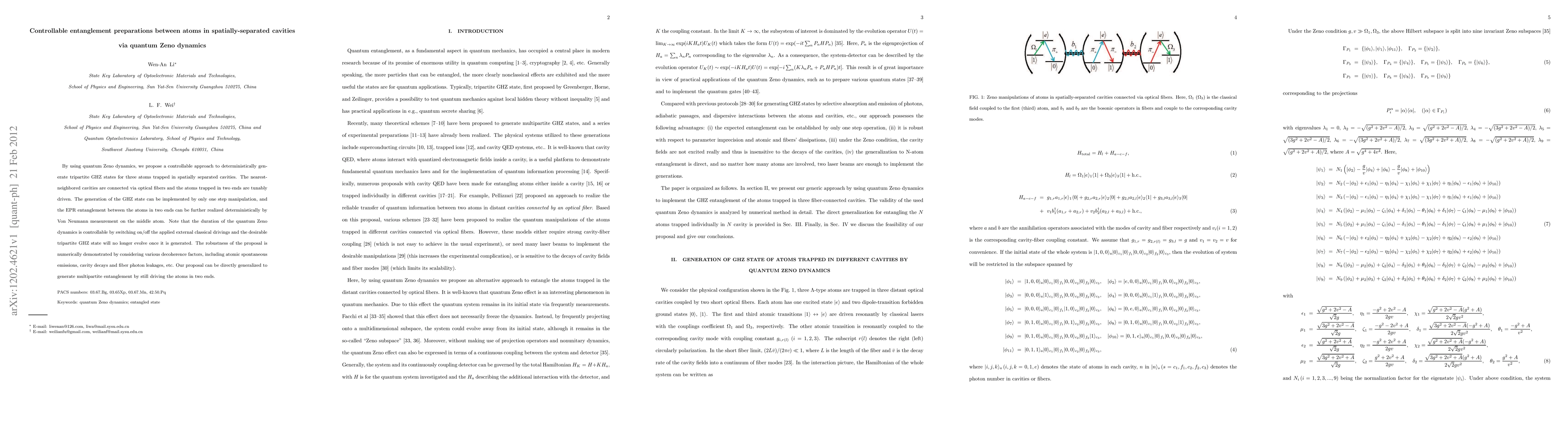 Summary: This paper proposes a method to deterministically create tripartite GHZ states among three spatially-separated atoms using quantum Zeno dynamics. By tuning the interactions between atoms in connected cavities and employing Von Neumann measurements, entanglement can be generated with robustness against decoherence factors.