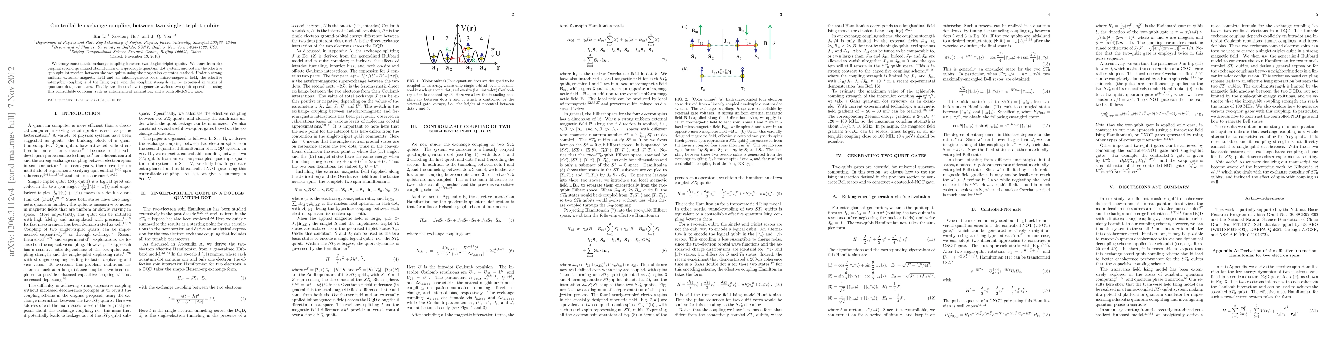 This paper investigates controllable exchange coupling between two singlet-triplet qubits using a quadruple quantum dot system. It derives an Ising-type spin-spin interaction under specific magnetic fields, enabling the generation of various two-qubit operations like entanglement and controlled-NOT gates.