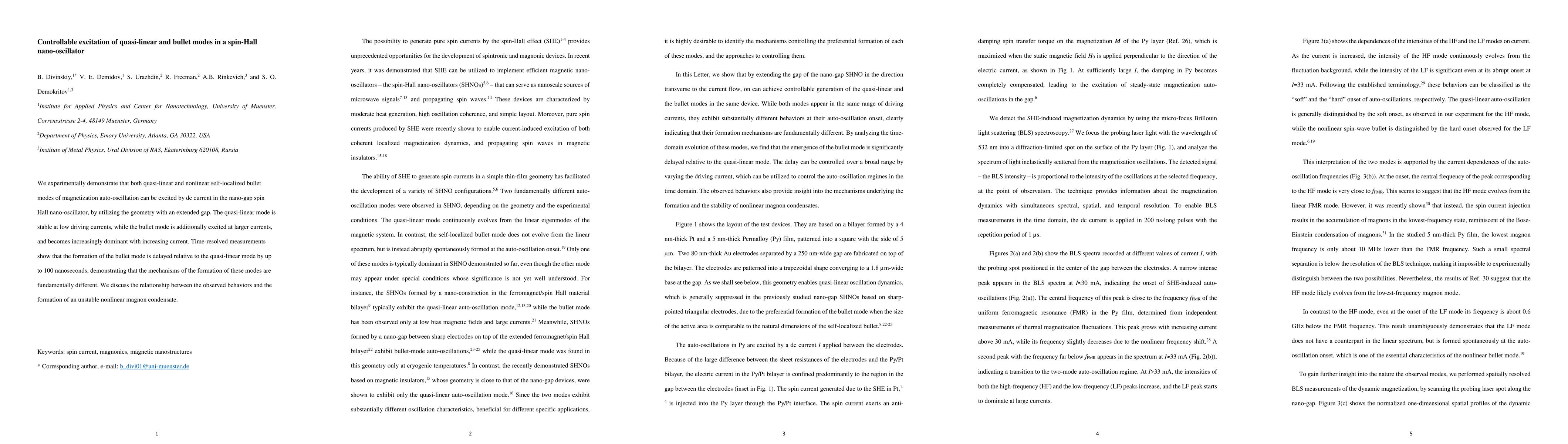 This paper demonstrates the controllable excitation of quasi-linear and bullet modes in a spin-Hall nano-oscillator using dc current, with the quasi-linear mode stable at low currents and the bullet mode emerging at higher currents. The study reveals a 100 nanosecond delay in bullet mode formation, indicating distinct formation mechanisms.