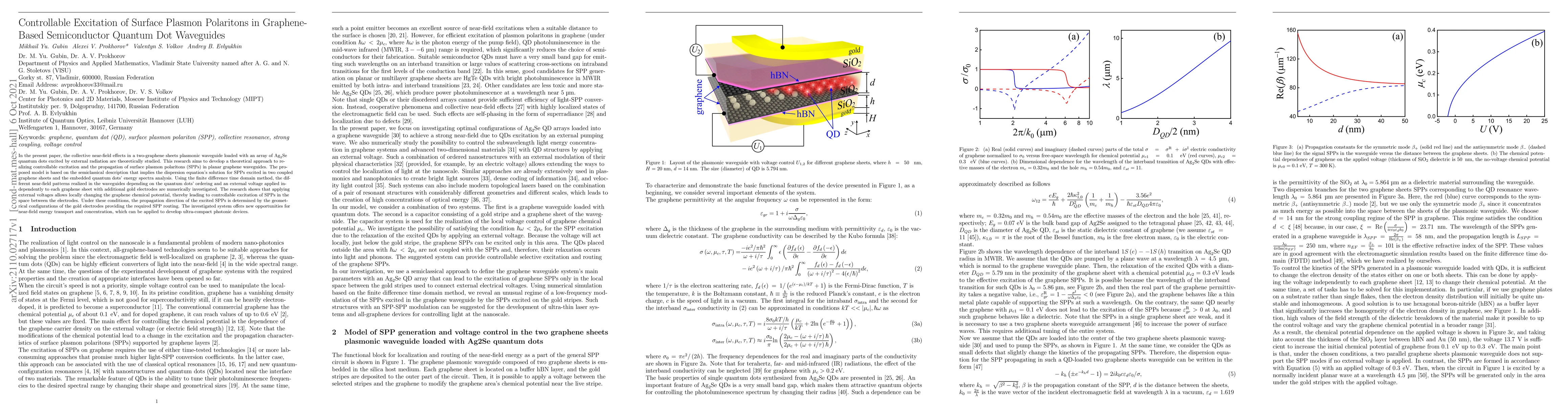 In the present paper, the collective near-field effects in a two-graphene sheets plasmonic waveguide loaded with an array of Ag$_2$Se quantum dots excited by external radiation are theoretically studied. This research aims to develop a theoretical approach to realizing controllable excitation and the propagation of surface plasmon polaritons (SPPs) in planar graphene waveguides. The proposed model is based on the semiclassical description that implies the dispersion equation's solution for SPPs excited in two coupled graphene sheets and the embedded quantum dots' energy spectra analysis. Using the finite difference time domain method, the different near-field patterns realized in the waveguides depending on the quantum dots' ordering and an external voltage applied independently to each graphene sheet with additional gold electrodes are numerically investigated. The research shows that applying external voltages allows locally changing the graphene chemical potential, thereby leading to controllable excitation of SPPs in the space between the electrodes. Under these conditions, the propagation direction of the excited SPPs is determined by the geometrical configurations of the gold electrodes providing the required SPP routing. The investigated system offers new opportunities for near-field energy transport and concentration, which can be applied to develop ultra-compact photonic devices.