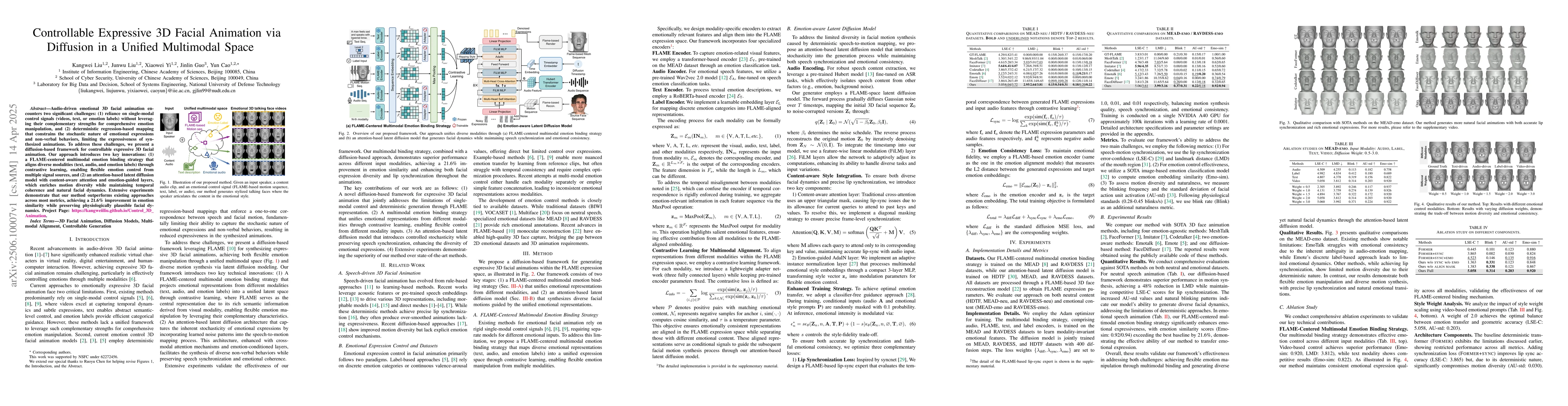 This paper introduces a diffusion-based framework for controllable expressive 3D facial animation that outperforms existing approaches in emotion similarity and preserves physiologically plausible dynamics, using a multimodal space to align diverse modalities.