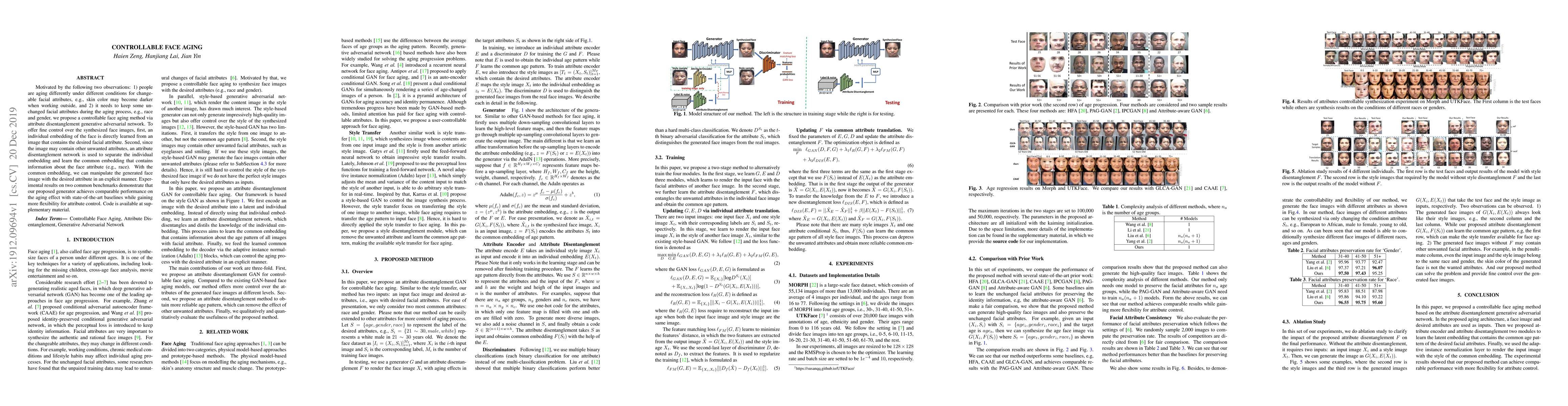 This paper proposes a controllable face aging method using an attribute disentanglement generative adversarial network to age faces while preserving specific attributes like race and gender. The method learns individual embeddings and disentangles unwanted attributes, allowing for precise manipulation of the aging effect.