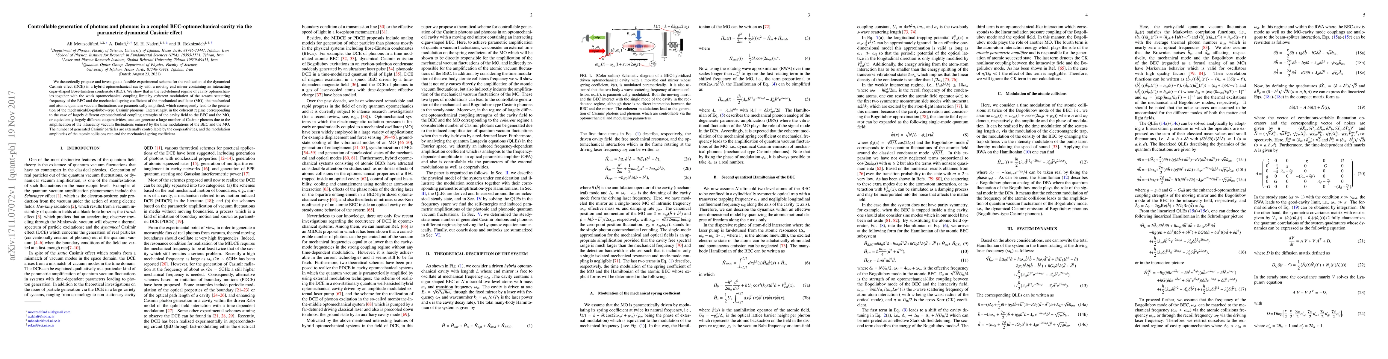 This paper proposes a scheme for generating photons and phonons via the dynamical Casimir effect in a hybrid optomechanical cavity with a moving end mirror and a Bose-Einstein condensate. The study demonstrates that parametric amplification of quantum vacuum fluctuations can be controlled to produce a large number of Casimir photons and phonons, with the number of generated particles tunable by the modulation of the condensate's scattering frequency and the mechanical oscillator's spring coefficient.