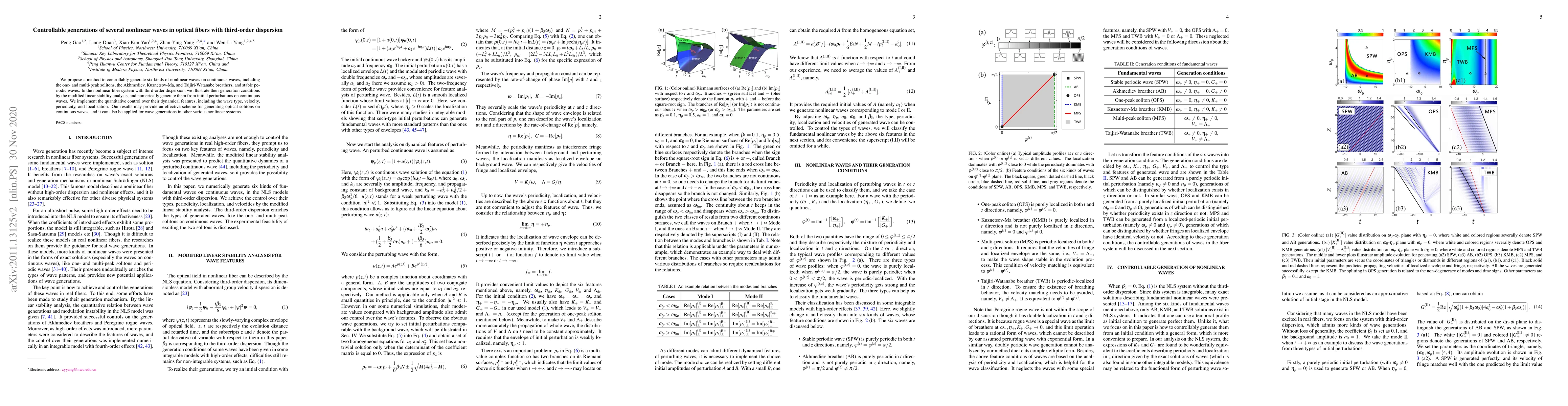 This paper proposes a method to generate six types of nonlinear waves in optical fibers with controlled features, and demonstrates their generation using modified linear stability analysis and numerical simulations.