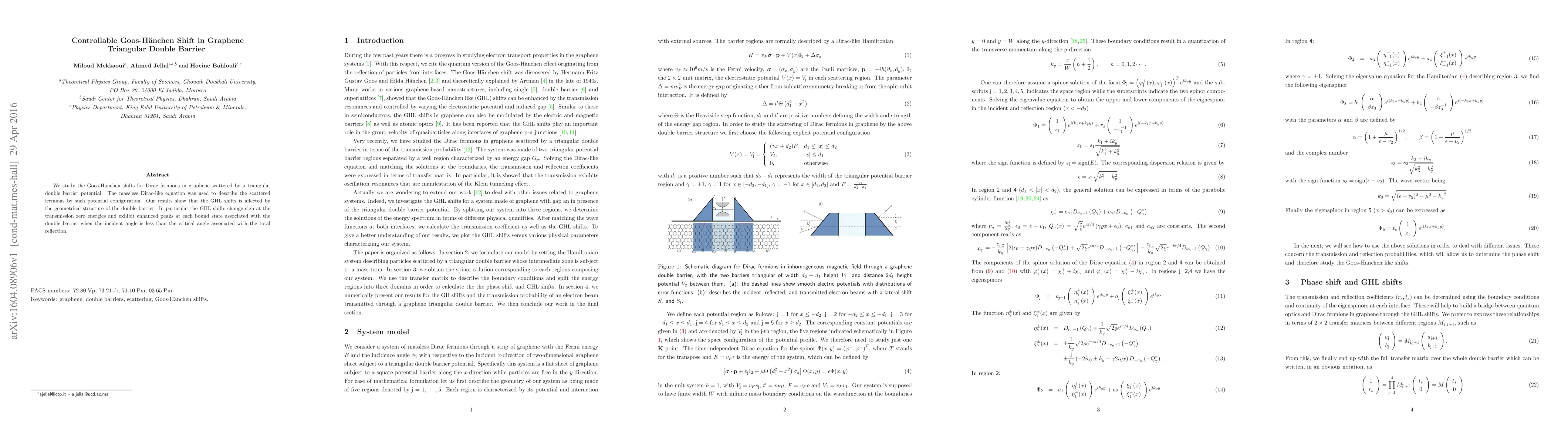 We study the Goos-H\"anchen shifts for Dirac fermions in graphene scattered by a triangular double barrier potential. The massless Dirac-like equation was used to describe the scattered fermions by such potential configuration. Our results show that the GHL shifts is affected by the geometrical structure of the double barrier. In particular the GHL shifts change sign at the transmission zero energies and exhibit enhanced peaks at each bound state associated with the double barrier when the incident angle is less than the critical angle associated with the total reflection.