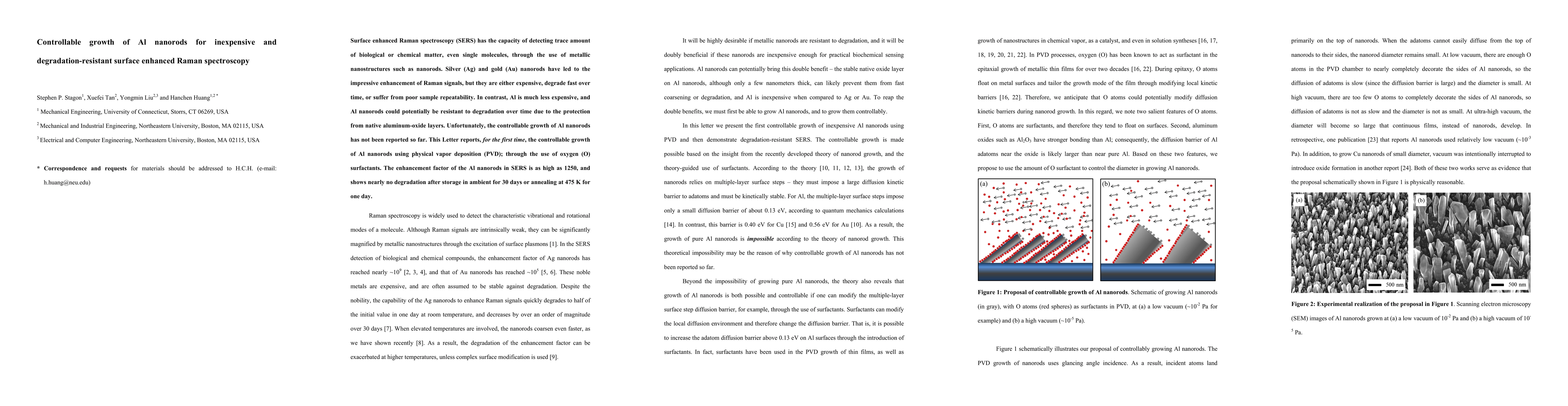 This paper reports the first controllable growth of aluminum (Al) nanorods via physical vapor deposition using oxygen surfactants, aiming to create an inexpensive and degradation-resistant SERS substrate. The Al nanorods exhibit a high SERS enhancement factor of 1250 and show significant stability over time.