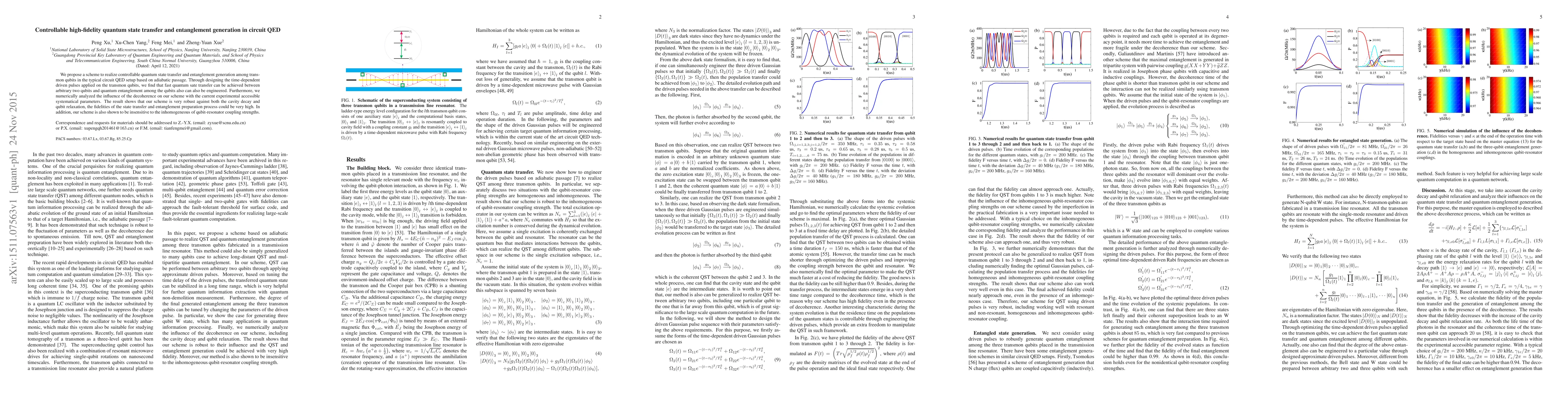 This paper proposes a method for high-fidelity quantum state transfer and entanglement generation among transmon qubits in circuit QED using adiabatic passage. The scheme is robust against decoherence and inhomogeneous coupling variations, ensuring high fidelity in state transfer and entanglement preparation.