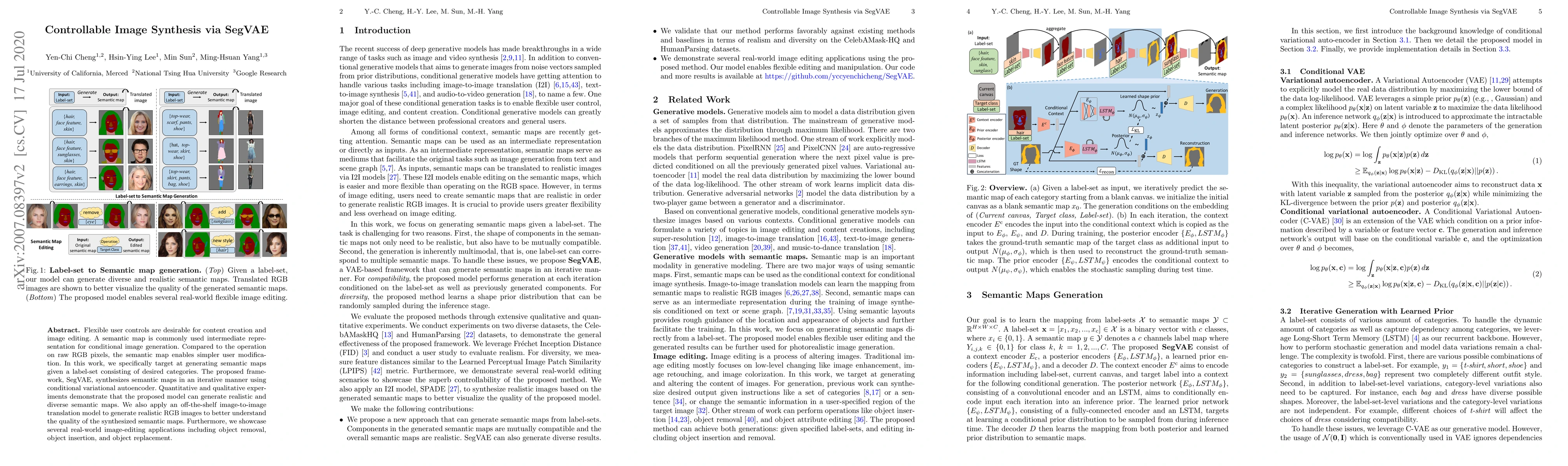 The SegVAE framework synthesizes semantic maps using a conditional variational autoencoder, enabling flexible user controls for image editing. Experiments show it generates realistic and diverse semantic maps, which can be translated into RGB images for practical applications like object manipulation.