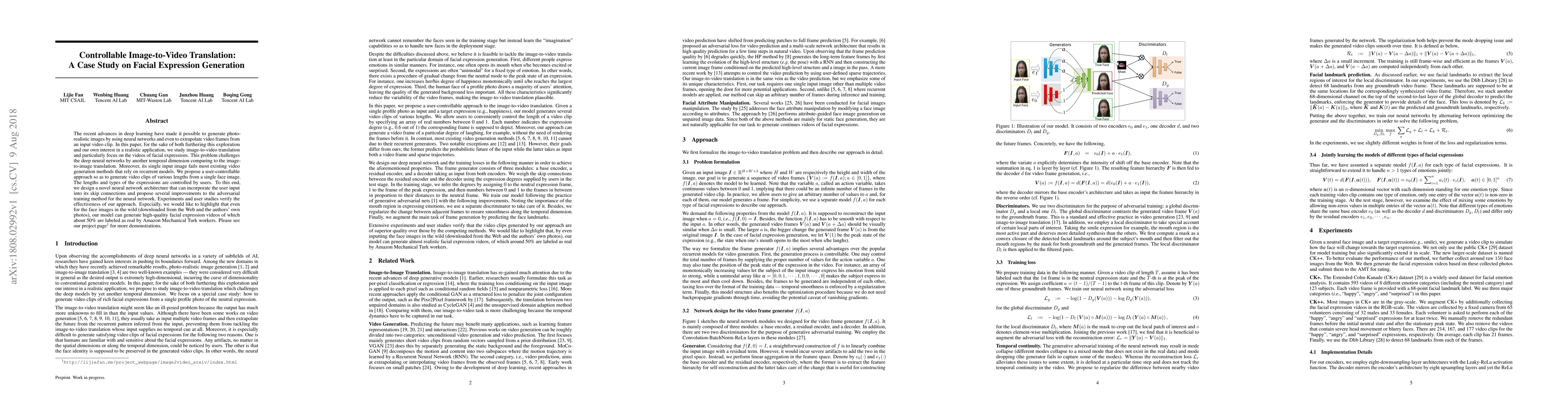 This paper proposes a user-controllable neural network for generating video clips of facial expressions from single input images, addressing the challenge of incorporating temporal dimensions in image-to-video translation. The model achieves high-quality results, with 50% of generated videos deemed realistic by user studies.