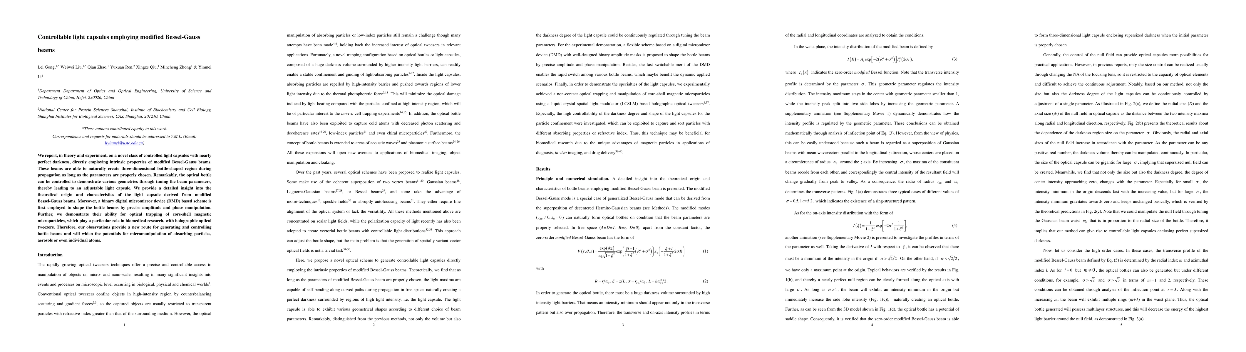 This research paper presents a theoretical and experimental investigation into controllable light capsules utilizing modified Bessel-Gauss beams, which can create and manipulate three-dimensional bottle-shaped optical regions. The study also introduces a DMD-based method to shape these beams and demonstrates their application in optical trapping of magnetic microparticles, highlighting potential advancements in micromanipulation techniques.