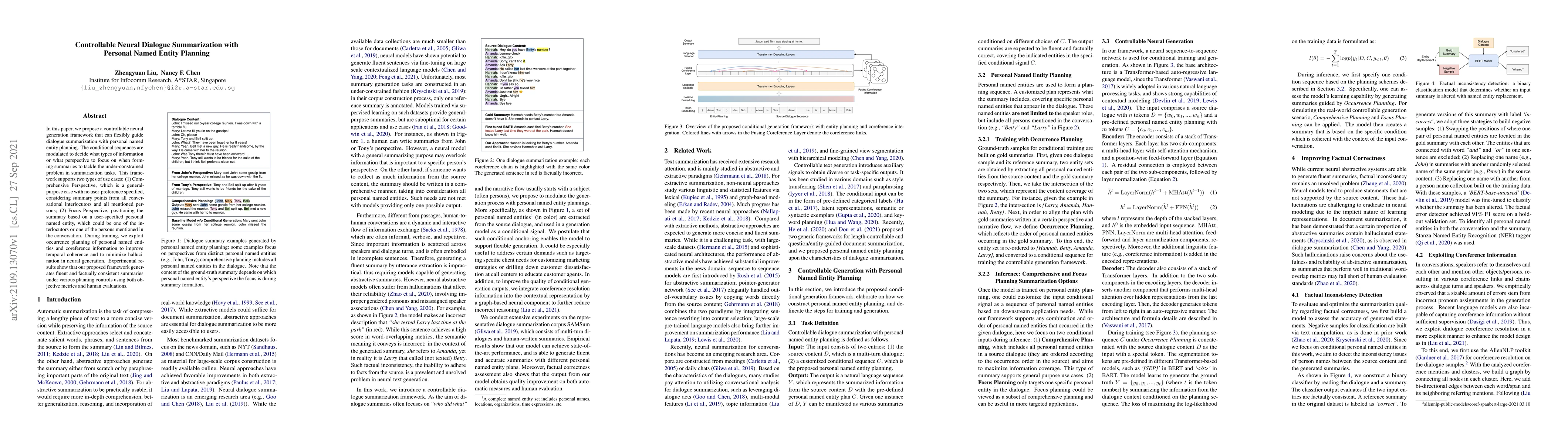 This paper introduces a controllable neural framework for dialogue summarization that employs personal named entity planning to guide summarization. It supports two perspectives: comprehensive and focus, with training leveraging named entity occurrence and coreference to improve coherence. Experimental results demonstrate its effectiveness in generating coherent and accurate summaries.