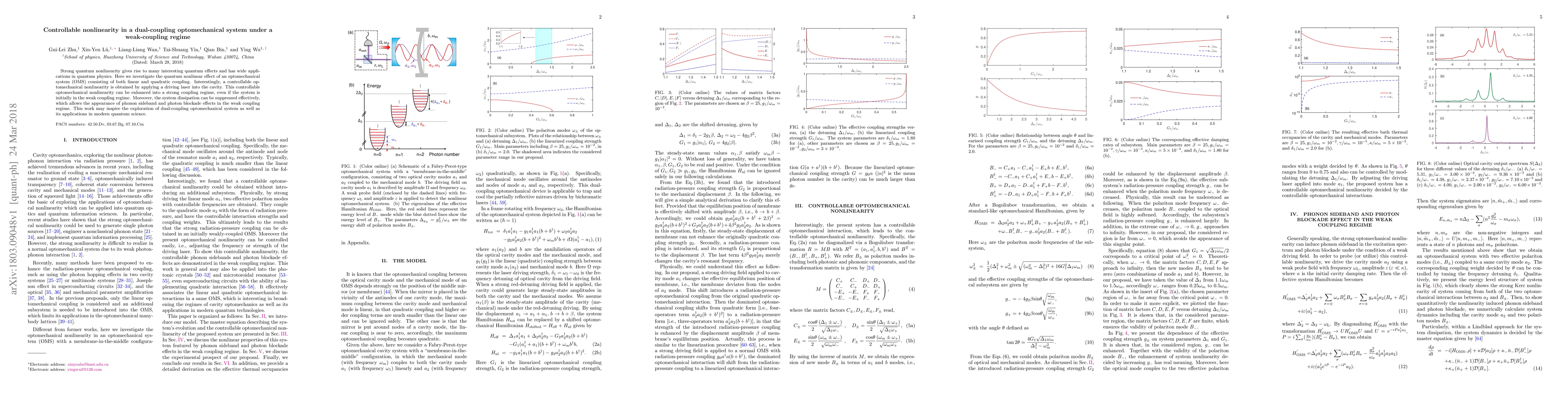 This paper explores a dual-coupling optomechanical system where controllable nonlinear effects are achieved through a driving laser, enabling transition from weak to strong coupling regimes. The study highlights enhanced phonon sideband and photon blockade effects, suggesting potential applications in quantum science.