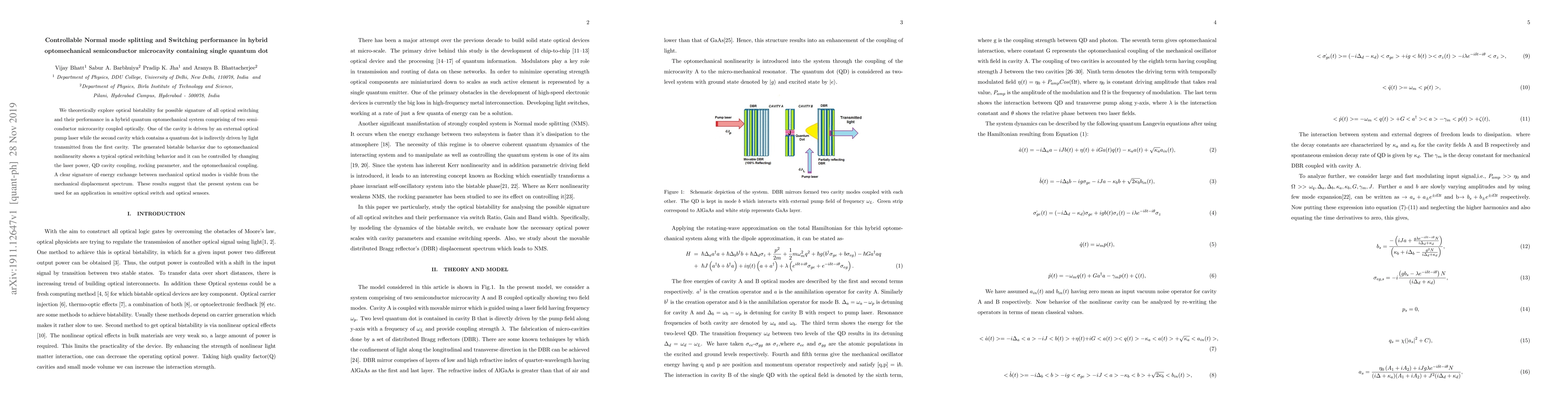 We theoretically explore optical bistability for possible signature of all optical switching and their performance in a hybrid quantum optomechanical system comprising of two semiconductor microcavity coupled optically. One of the cavity is driven by an external optical pump laser while the second cavity which contains a quantum dot is indirectly driven by light transmitted from the first cavity. The generated bistable behavior due to optomechanical nonlinearity shows a typical optical switching behavior and it can be controlled by changing the laser power, QD cavity coupling, rocking parameter, and the optomechanical coupling. A clear signature of energy exchange between mechanical optical modes is visible from the mechanical displacement spectrum. These results suggest that the present system can be used for an application in sensitive optical switch and optical sensors.