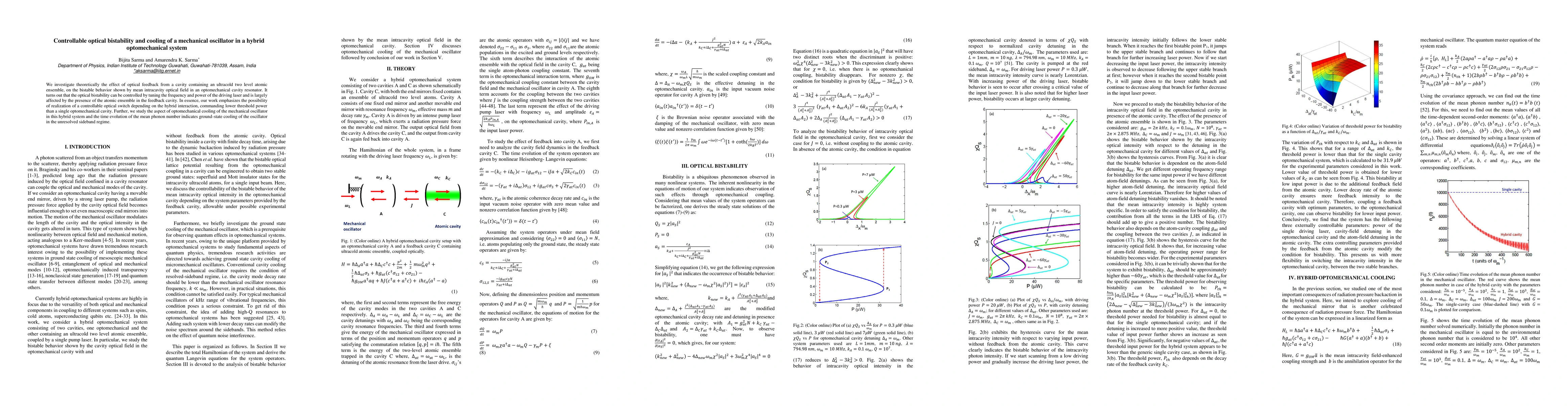 We investigate theoretically the effect of optical feedback from a cavity containing an ultracold two level atomic ensemble, on the bistable behavior shown by mean intracavity optical field in an optomechanical cavity resonator. It turns out that the optical bistability can be controlled by tuning the frequency and power of the driving laser and is largely affected by the presence of the atomic ensemble in the feedback cavity. In essence, our work emphasizes the possibility of realization of a controllable optical switch depending on the hybrid interaction, commanding lower threshold power than a single optomechanical cavity. Further, we study the aspect of optomechanical cooling of the mechanical oscillator in this hybrid system and the time evolution of the mean phonon number indicates ground-state cooling of the oscillator in the unresolved sideband regime.