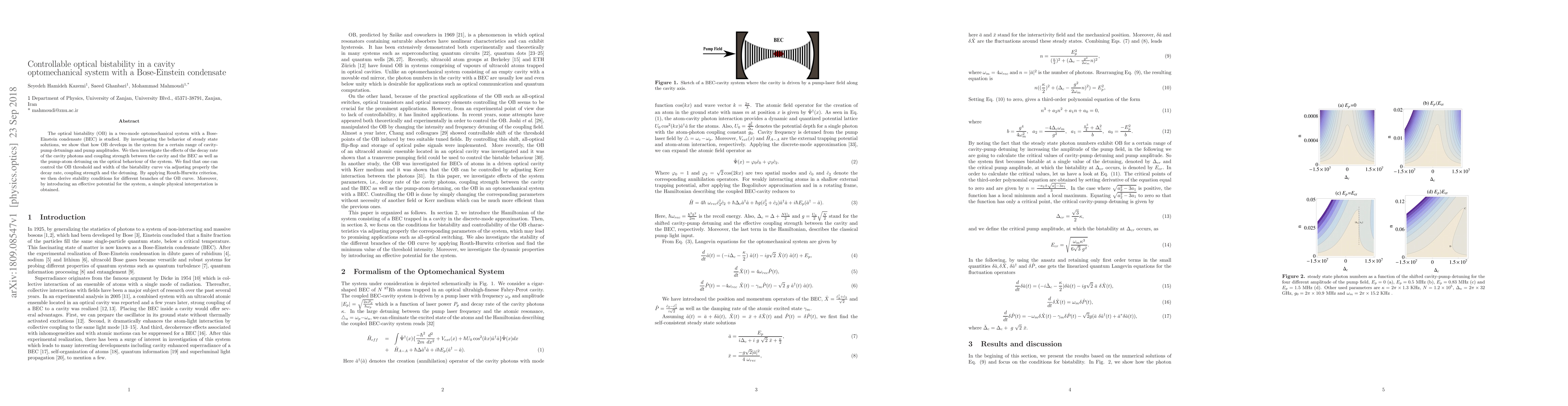This paper investigates optical bistability in a cavity optomechanical system with a Bose-Einstein condensate, demonstrating controllable bistability through adjustments in decay rate, coupling strength, and detuning. Stability conditions are derived using the Routh-Hurwitz criterion, and an effective potential provides a physical interpretation of the system's behavior.