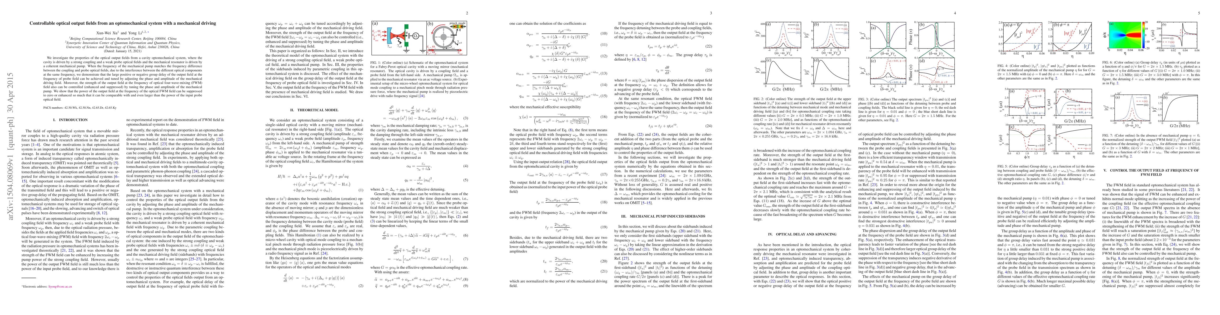 We investigate the properties of the optical output fields from a cavity optomechanical system, where the cavity is driven by a strong coupling and a weak probe optical fields and the mechanical resonator is driven by a coherent mechanical pump. When the frequency of the mechanical pump matches the frequency difference between the coupling and probe optical fields, due to the interference between the different optical components at the same frequency, we demonstrate that the large positive or negative group delay of the output field at the frequency of probe field can be achieved and tuned by adjusting the phase and amplitude of the mechanical driving field. Moreover, the strength of the output field at the frequency of optical four-wave-mixing (FWM) field also can be controlled (enhanced and suppressed) by tuning the phase and amplitude of the mechanical pump. We show that the power of the output field at the frequency of the optical FWM field can be suppressed to zero or enhanced so much that it can be comparable with and even larger than the power of the input probe optical field.