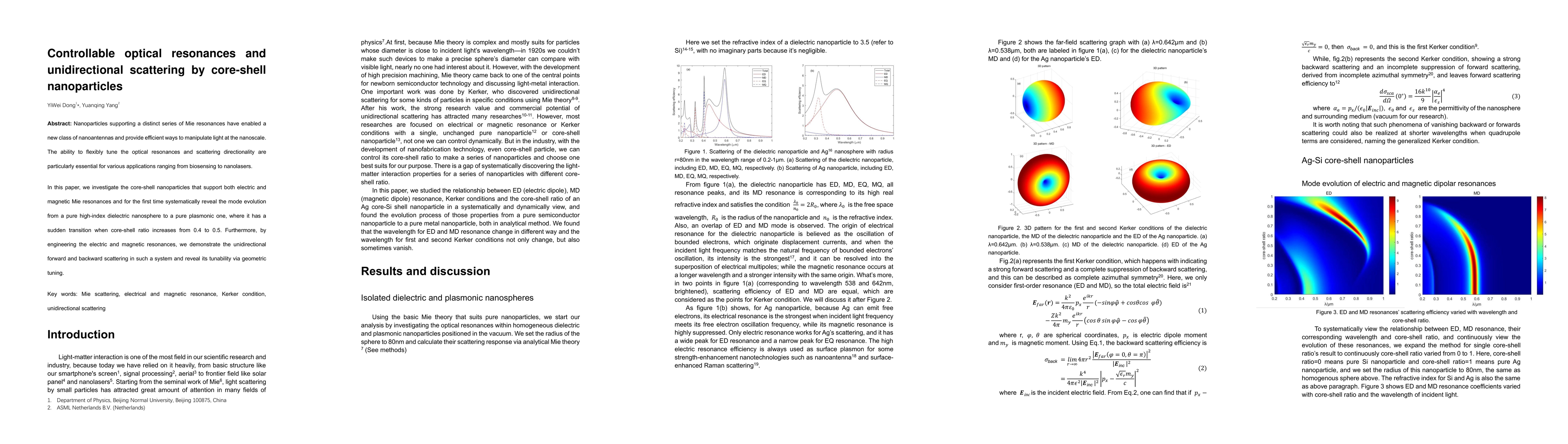 This paper explores core-shell nanoparticles that support electric and magnetic Mie resonances, revealing a transition in optical resonance modes as the core-shell ratio changes. The study demonstrates unidirectional forward and backward scattering, showcasing the tunability of these effects through geometric adjustments for potential applications in nanoantennas and biosensing.