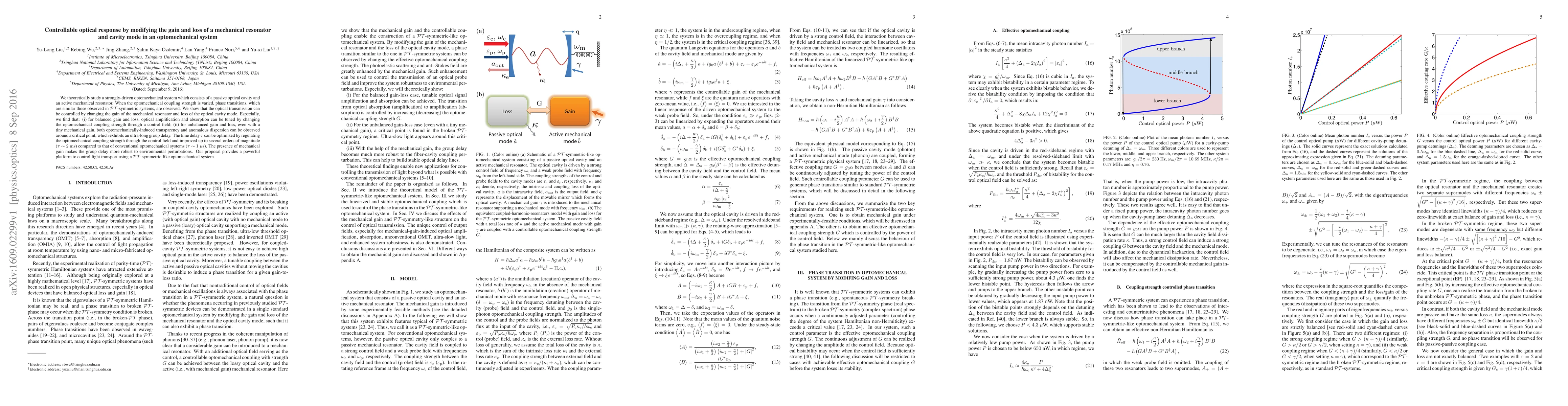 This paper proposes a method to control optical response in an optomechanical system by adjusting the gain of a mechanical resonator and the loss of an optical cavity. It demonstrates that varying optomechanical coupling strength can lead to tunable optical amplification or absorption, and significant group delay enhancements up to several milliseconds, providing a robust platform for controlling light transport.