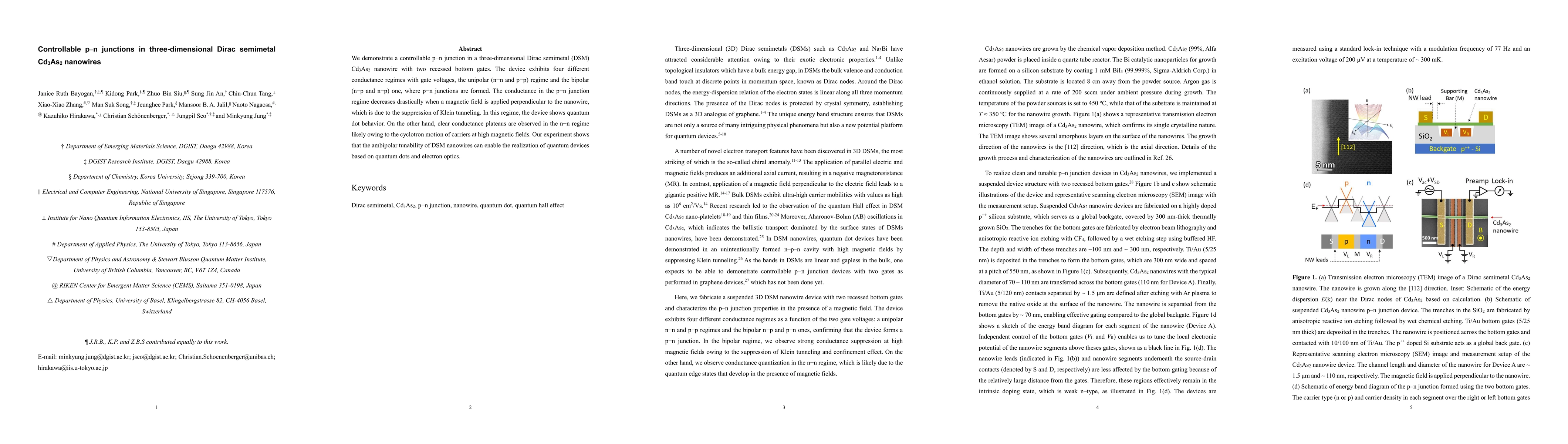 Researchers created a controllable p-n junction in 3D Dirac semimetal nanowires, demonstrating four different conductance regimes with gate voltages and revealing quantum dot behavior and ambipolar tunability.