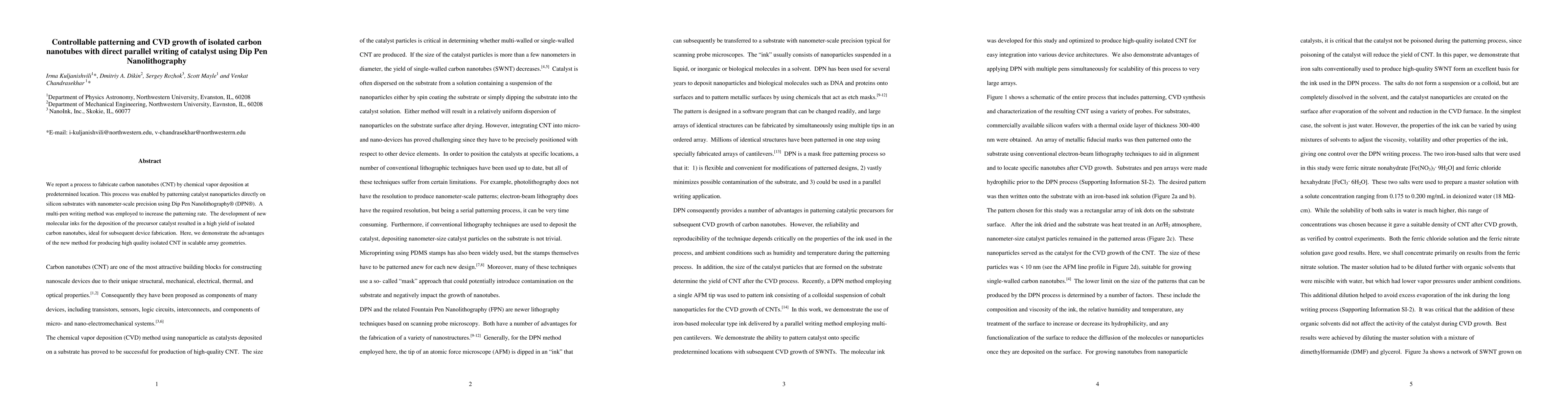 This study presents a method to precisely fabricate carbon nanotubes using chemical vapor deposition, enabled by Dip Pen Nanolithography to pattern catalyst nanoparticles. The multi-pen writing technique and new molecular inks enhance the yield and isolation of carbon nanotubes, suitable for scalable device fabrication.