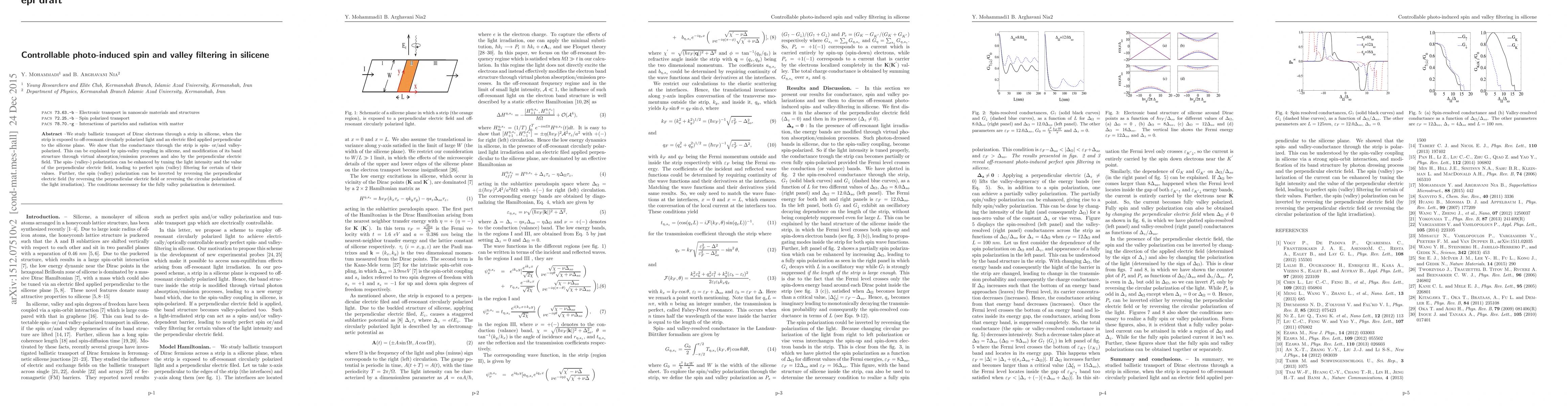 We study ballistic transport of Dirac electrons through a strip in silicene, when the strip is exposed to off-resonant circularly polarized light and an electric field applied perpendicular to the silicene plane. We show that the conductance through the strip is spin- or/and valley-polarized. This can be explained by spin-valley coupling in silicene, and modification of its band structure through virtual absorption/emission processes and also by the perpendicular electric field. The spin- (valley-) polarization can be enhanced by tuning the light intensity and the value of the perpendicular electric field, leading to perfect spin (valley) filtering for certain of their values. Further, the spin (valley) polarization can be inverted by reversing the perpendicular electric field (by reversing the perpendicular electric field or reversing the circular polarization of the light irradiation). The conditions necessary for the fully valley polarization is determined.