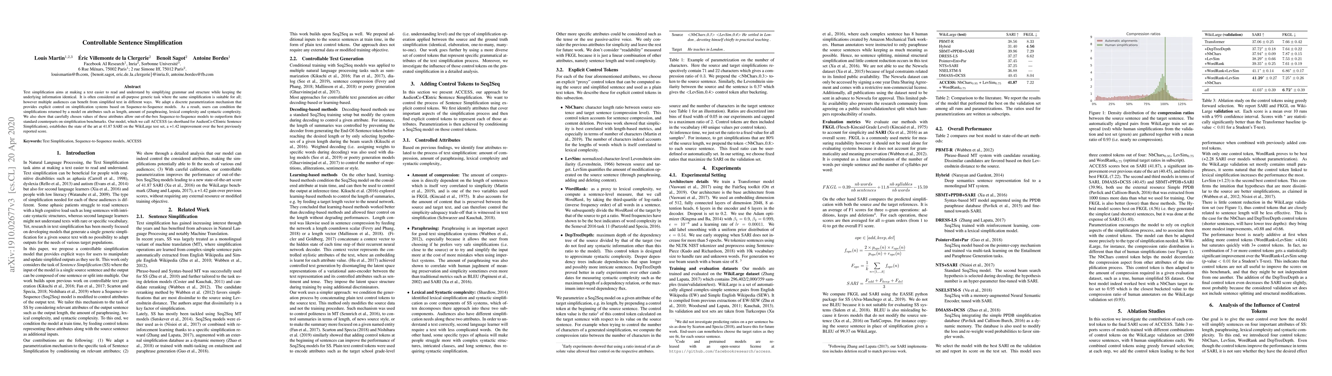 This paper introduces ACCESS, a controllable sentence simplification model that adapts Sequence-to-Sequence models to provide explicit control over simplification parameters like length and complexity. ACCESS achieves a state-of-the-art score of 41.87 SARI on the WikiLarge test set, outperforming previous models.