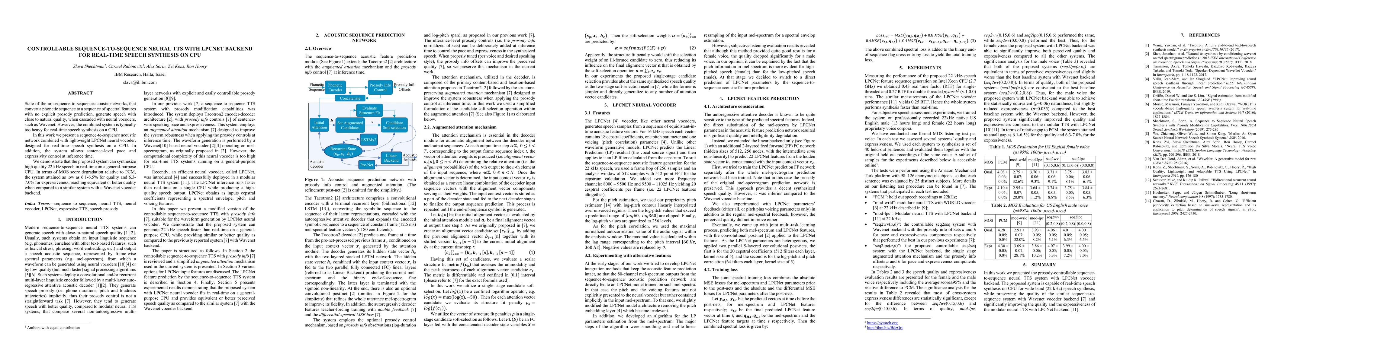 This research introduces a sequence-to-sequence neural network combined with a lightweight LPCNet vocoder for real-time CPU-based speech synthesis, achieving high-quality output with controllable prosody. The system maintains comparable quality to systems using Wavenet, with minimal degradation.