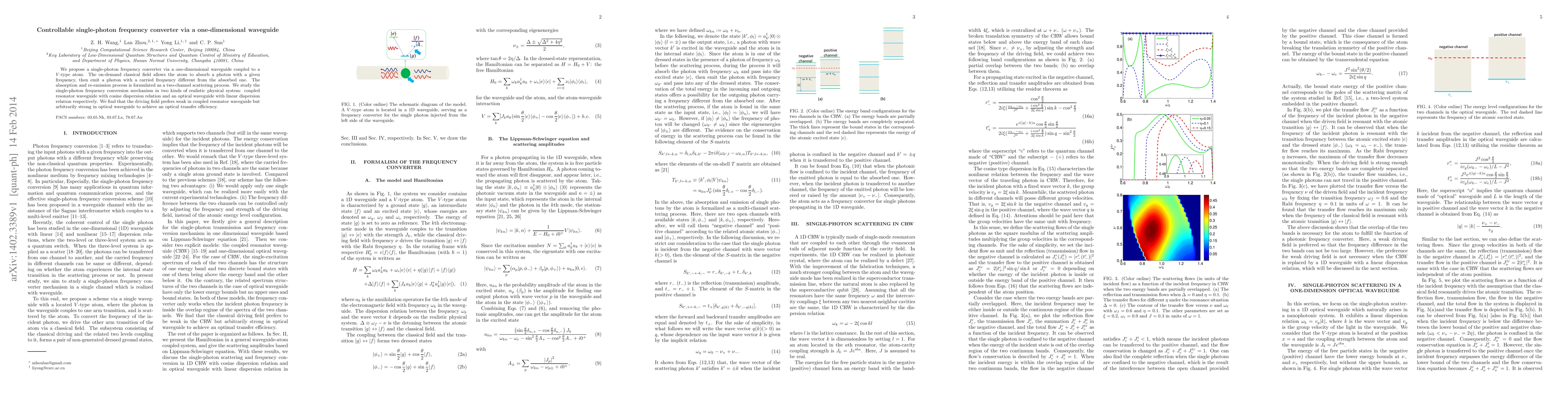 We propose a single-photon frequency converter via a one-dimensional waveguide coupled to a $V$-type atom. The on-demand classical field allows the atom to absorb a photon with a given frequency, then emit a photon with a carried frequency different from the absorbed one. The absorption and re-emission process is formulated as a two-channel scattering process. We study the single-photon frequency conversion mechanism in two kinds of realistic physical system: coupled resonator waveguide with cosine dispersion relation and an optical waveguide with linear dispersion relation respectively. We find that the driving field prefers weak in coupled resonator waveguide but arbitrarily strong in optical waveguide to achieve an optical transfer efficiency.
