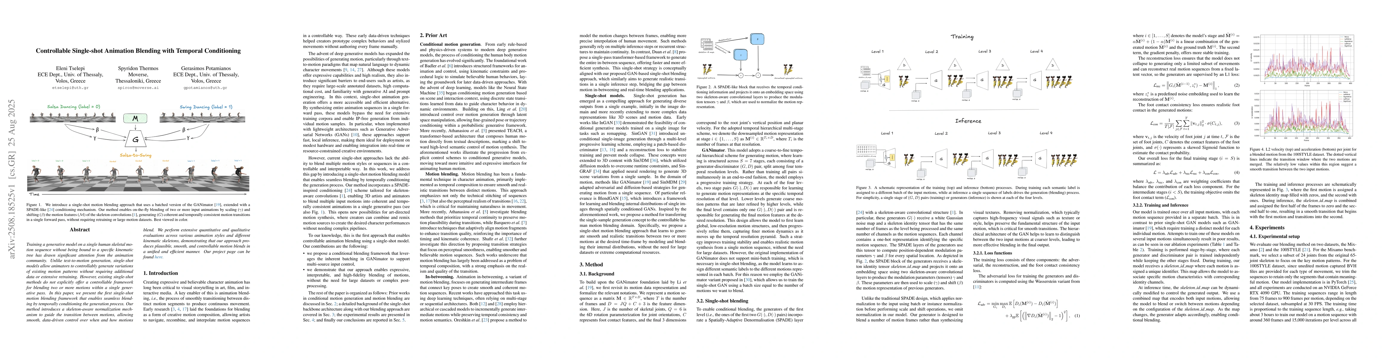 Training a generative model on a single human skeletal motion sequence without being bound to a specific kinematic tree has drawn significant attention from the animation community. Unlike text-to-motion generation, single-shot models allow animators to controllably generate variations of existing motion patterns without requiring additional data or extensive retraining. However, existing single-shot methods do not explicitly offer a controllable framework for blending two or more motions within a single generative pass. In this paper, we present the first single-shot motion blending framework that enables seamless blending by temporally conditioning the generation process. Our method introduces a skeleton-aware normalization mechanism to guide the transition between motions, allowing smooth, data-driven control over when and how motions blend. We perform extensive quantitative and qualitative evaluations across various animation styles and different kinematic skeletons, demonstrating that our approach produces plausible, smooth, and controllable motion blends in a unified and efficient manner.