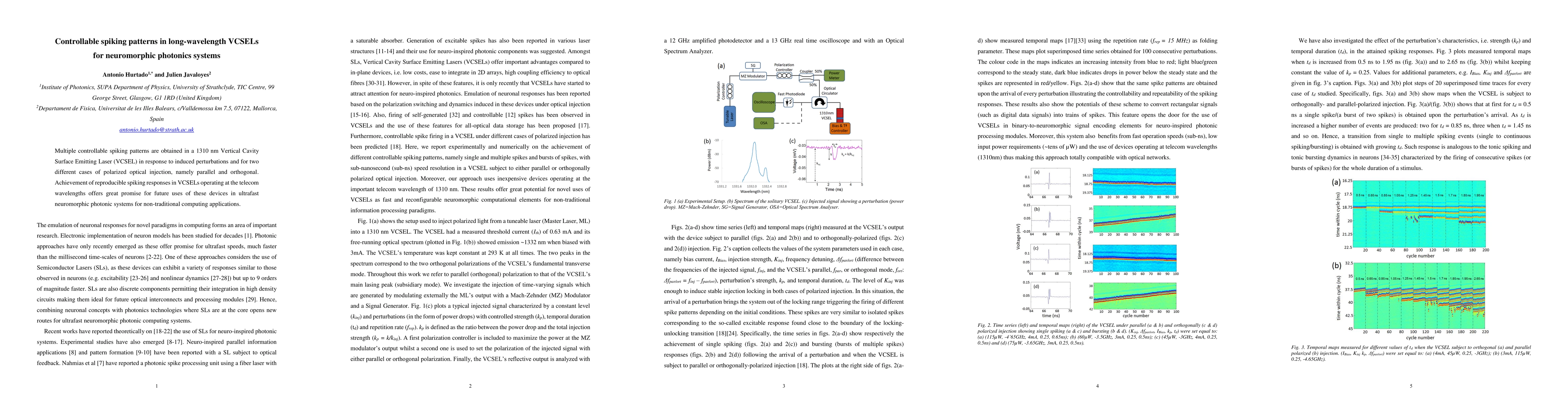Multiple controllable spiking patterns are obtained in a 1310 nm Vertical Cavity Surface Emitting Laser (VCSEL) in response to induced perturbations and for two different cases of polarized optical injection, namely parallel and orthogonal. Achievement of reproducible spiking responses in VCSELs operating at the telecom wavelengths offers great promise for future uses of these devices in ultrafast neuromorphic photonic systems for non-traditional computing applications.