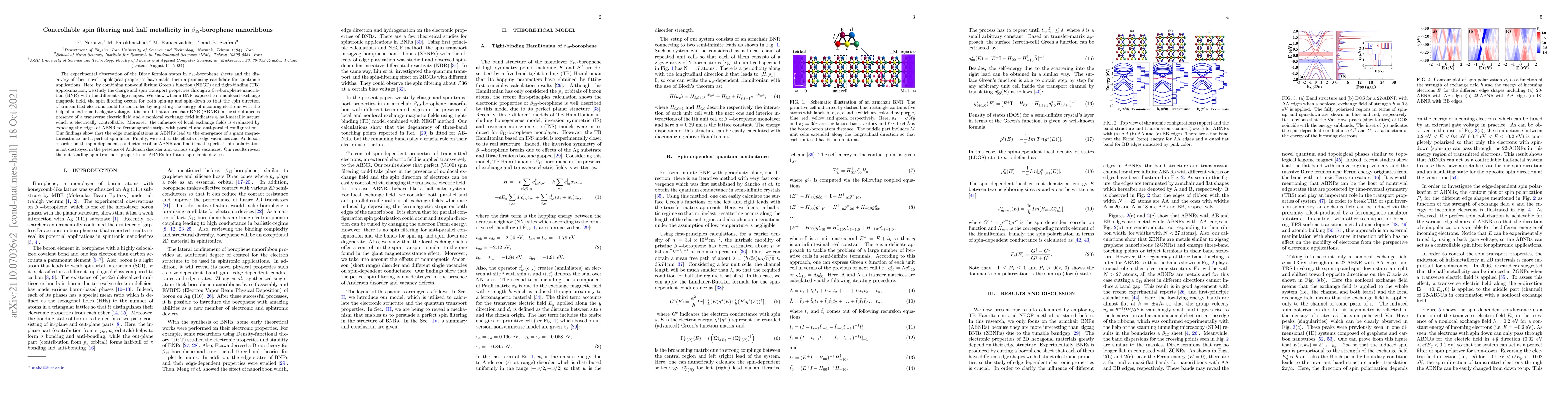 This paper explores the spin transport properties of $\beta_{12}$-borophene nanoribbons, demonstrating controllable spin filtering and half-metallicity through edge manipulation and external fields. The study reveals that armchair nanoribbons exhibit perfect spin polarization and giant magnetoresistance, making them promising for spintronic applications.