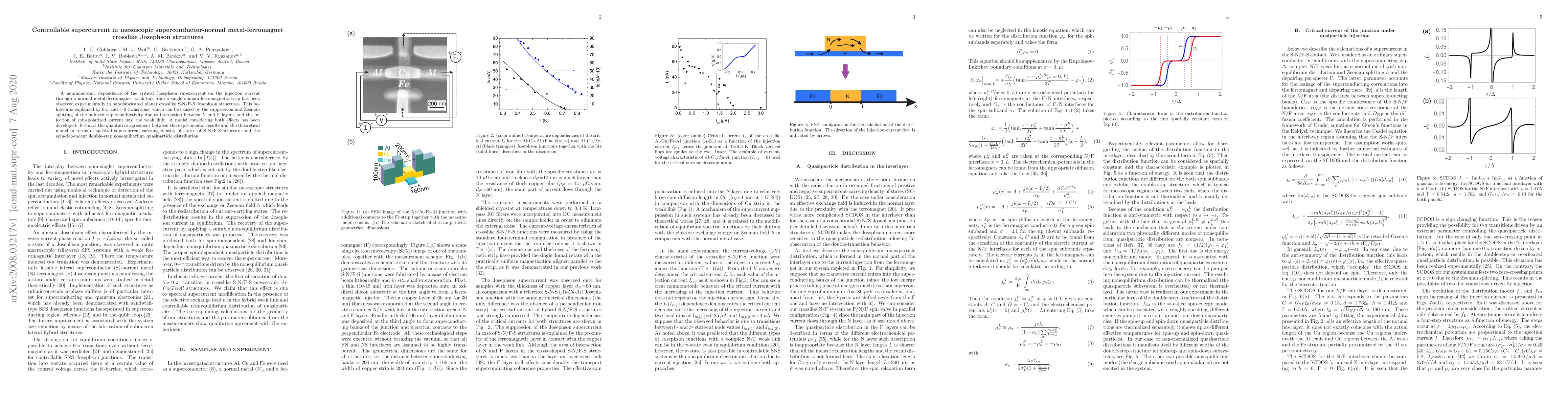 This paper explores the nonmonotonic critical Josephson supercurrent dependence in crosslike S-N/F-S structures, attributing it to 0-pi and pi-0 transitions due to ferromagnetic interactions and spin-polarized current. A developed model aligns experimental observations with theoretical predictions regarding spectral density and quasiparticle distribution.