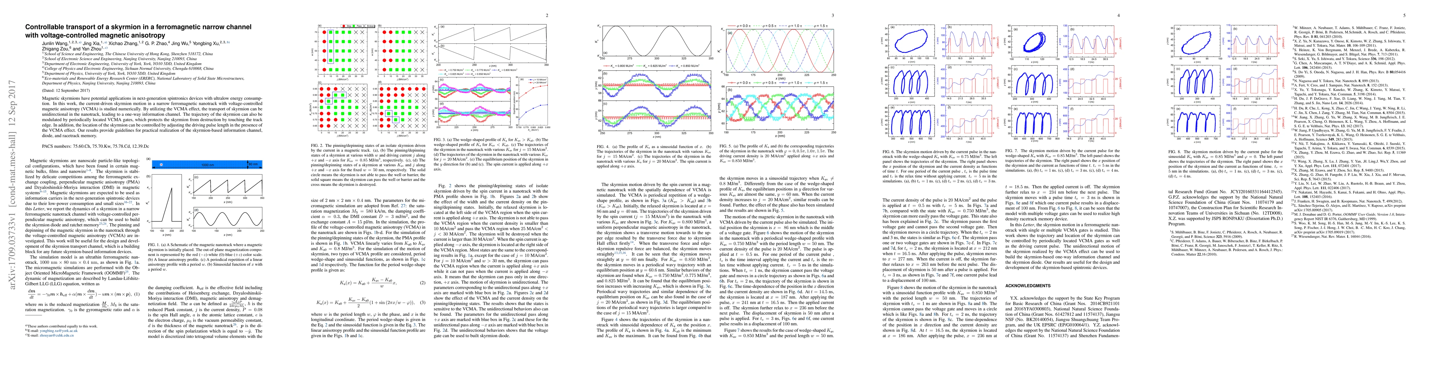 This paper investigates the controllable transport of magnetic skyrmions in a ferromagnetic nanotrack using voltage-controlled magnetic anisotropy (VCMA). The study demonstrates unidirectional skyrmion motion and protection from edge collisions, with skyrmion location controlled by driving pulse length, offering insights for spintronics applications.