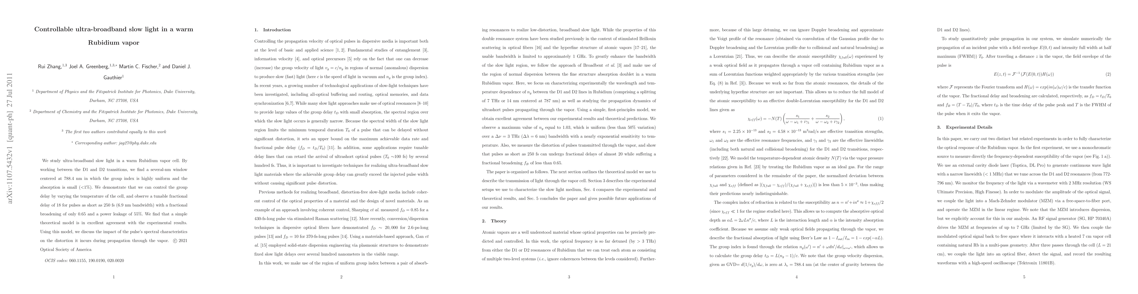 This paper investigates ultra-broadband slow light in warm Rubidium vapor, identifying a uniform group index window with minimal absorption. The group delay is controllable via temperature adjustments, achieving a tunable fractional delay of 18 for 250 fs pulses with minimal distortion.