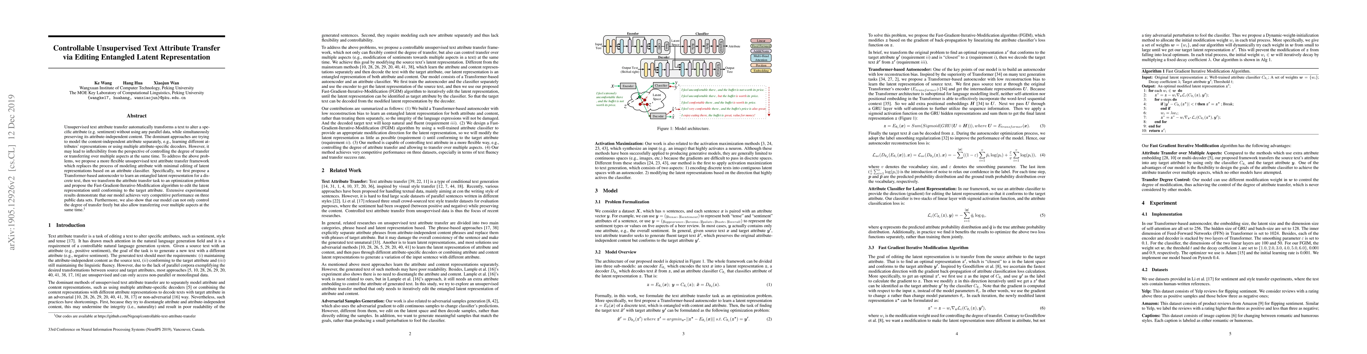 This paper proposes a novel framework for unsupervised text attribute transfer that edits entangled latent representations without parallel data, enabling flexible control over the degree and multiple attribute transfers. The method uses a Transformer-based autoencoder and an iterative modification algorithm to achieve competitive performance and flexibility.