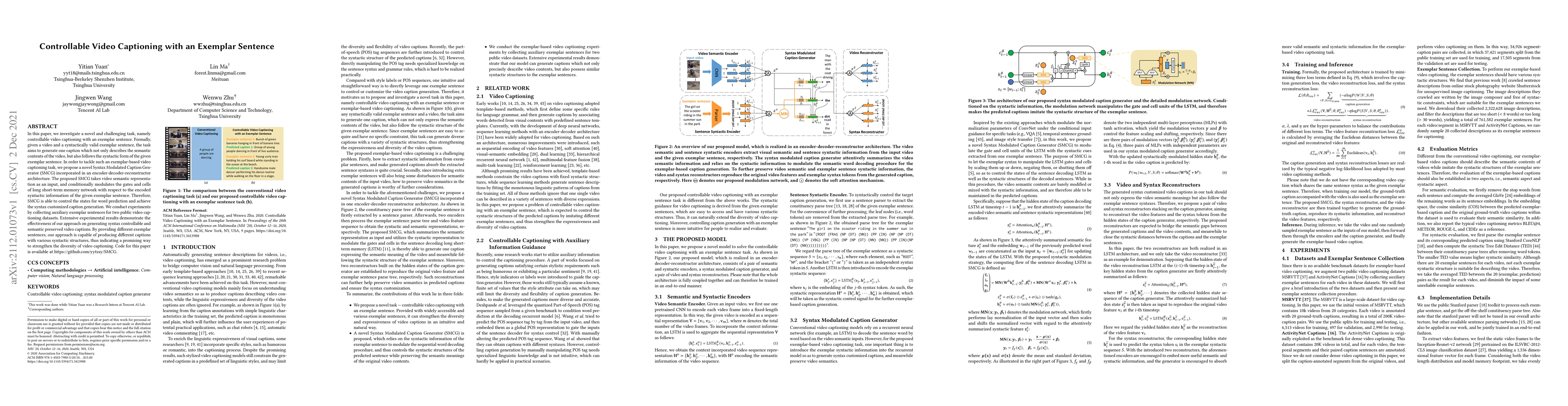 This paper proposes a Syntax Modulated Caption Generator (SMCG) for controllable video captioning, where an exemplar sentence guides the syntactic form of the generated caption. The SMCG modulates LSTM gates and cells based on the exemplar's syntax, achieving diverse and semantically accurate captions for different syntactic structures.