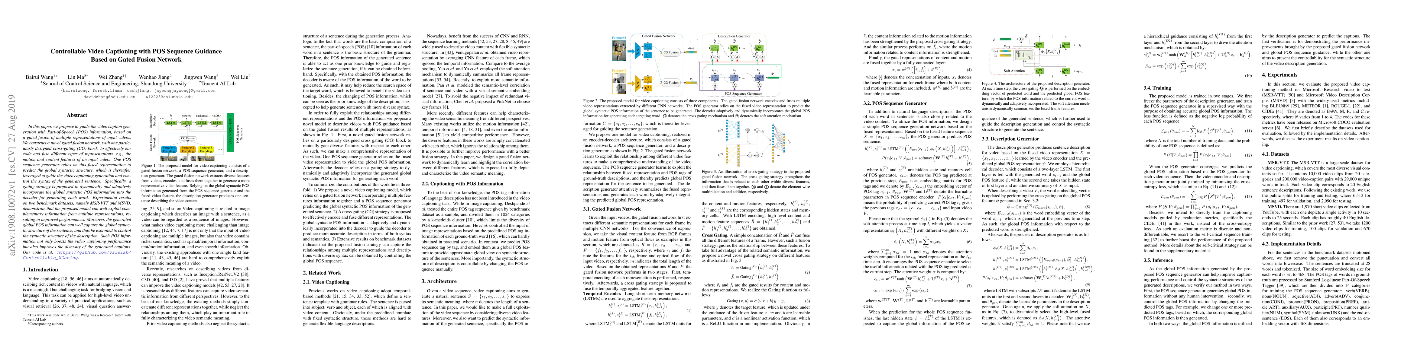 This paper proposes a gated fusion network with POS sequence guidance to enhance video captioning by incorporating Part-of-Speech information. The model dynamically integrates global syntactic POS information to control the syntax of generated captions, resulting in improved performance and caption diversity on MSR-VTT and MSVD datasets.