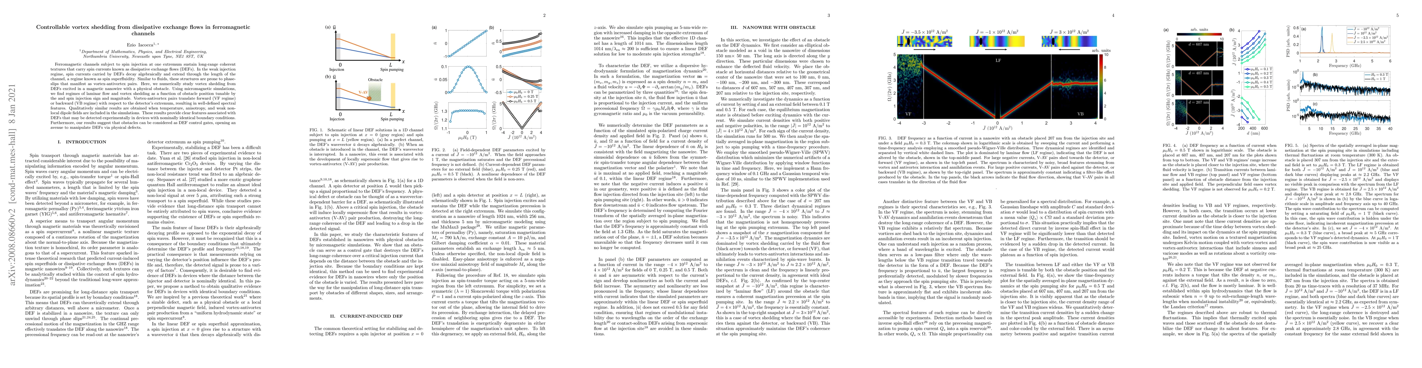 Ferromagnetic channels subject to spin injection at one extremum sustain long-range coherent textures that carry spin currents known as dissipative exchange flows (DEFs). In the weak injection regime, spin currents carried by DEFs decay algebraically and extend through the length of the channel, a regime known as spin superfluidity. Similar to fluids, these structures are prone to phase-slips that manifest as vortex-antivortex pairs. Here, we numerically study vortex shedding from DEFs excited in a magnetic nanowire with a physical obstacle. Using micromagnetic simulations, we find regimes of laminar flow and vortex shedding as a function of obstacle position tunable by the and spin injection sign and magnitude. Vortex-antivortex pairs translate forward (VF regime) or backward (VB regime) with respect to the detector's extremum, resulting in well-defined spectral features. Qualitatively similar results are obtained when temperature, anisotropy, and weak non-local dipole fields are included in the simulations. These results provide clear features associated with DEFs that may be detected experimentally in devices with nominally identical boundary conditions. Furthermore, our results suggest that obstacles can be considered as DEF control gates, opening an avenue to manipulate DEFs via physical defects.