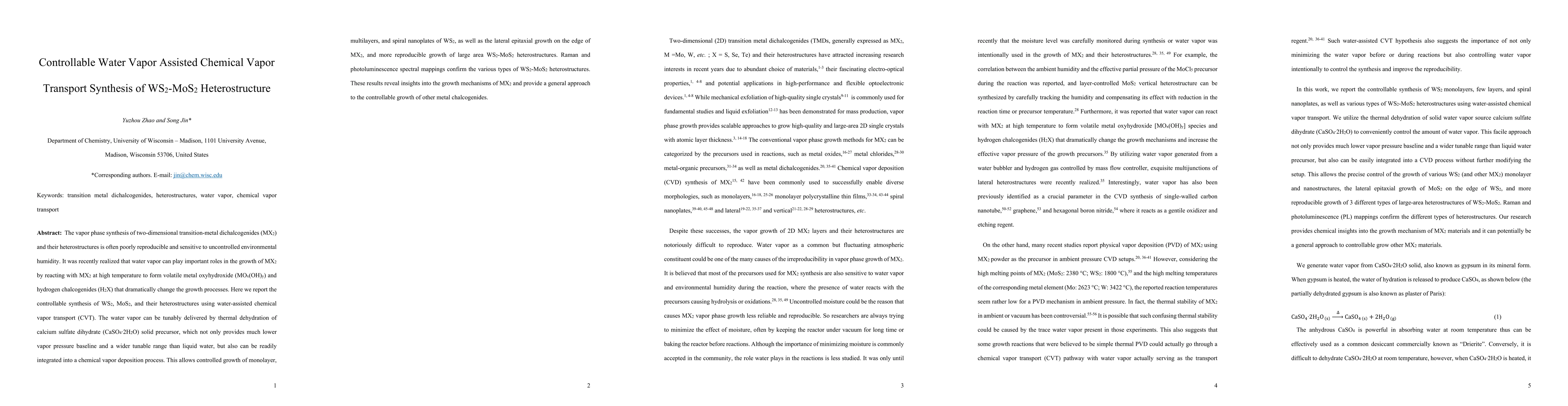 This research reports the controllable vapor phase synthesis of WS2 and MoS2 heterostructures using water-assisted chemical vapor transport, enabling reproducible growth of various WS2 forms and large-area WS2-MoS2 heterostructures, with tunable water vapor delivery from dehydrated calcium sulfate. Raman and photoluminescence analyses confirm the successful formation of different heterostructures.