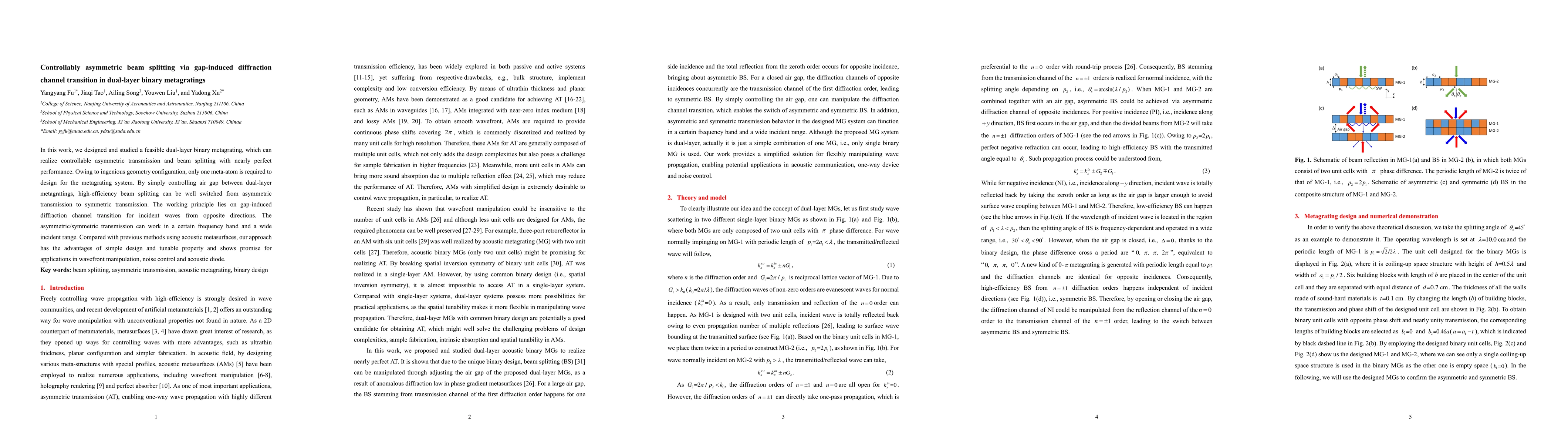 The research introduces a dual-layer binary metagrating design that enables controllable asymmetric transmission and beam splitting with high efficiency. By adjusting the air gap between the layers, the system can switch between asymmetric and symmetric transmission within a specific frequency band and broad incident angle range, offering a simple, tunable solution for wavefront manipulation, noise control, and acoustic diode applications.