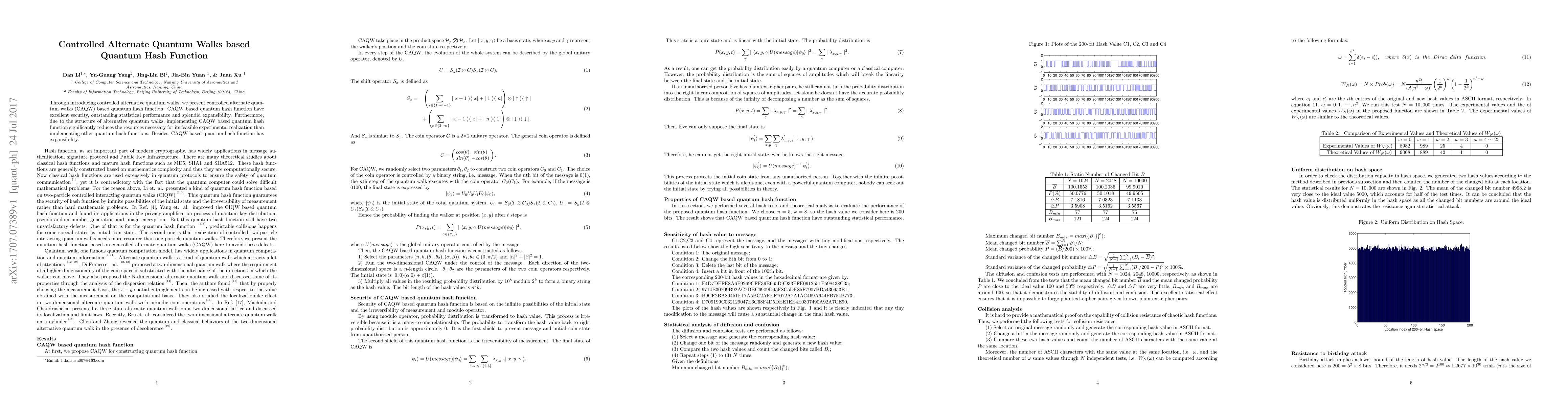 This paper introduces Controlled Alternate Quantum Walks based quantum hash functions, which offer excellent security, high statistical performance, and expansibility, making them more feasible to experimentally realize than other options.